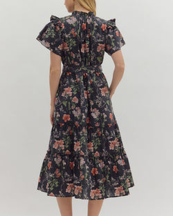 This elegant midi dress in black showcases a delicate floral print, enhanced by short flutter sleeves and a ruffled collar framing a graceful V-neckline with a subtle tie detail. The waist tie cinches to define your silhouette, while side pockets combine practicality with style, making it a refined choice for any occasion.