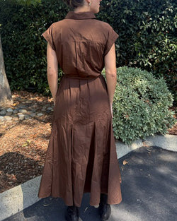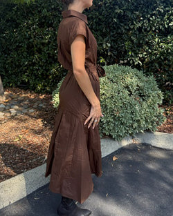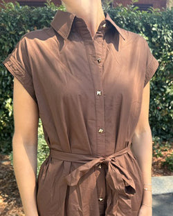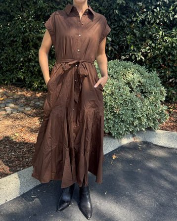 Elevate your wardrobe with this elegant brown midi dress featuring a classic collar and solid cap sleeves. The button-front closure adds refinement, while the self-tie sash at the waist provides a tailored silhouette. Practical side pockets blend seamlessly with the sleek design, offering both style and convenience for a polished, sophisticated look.