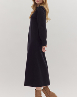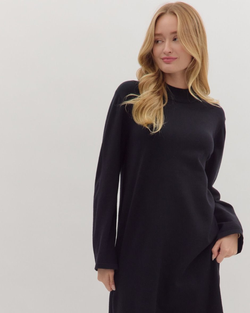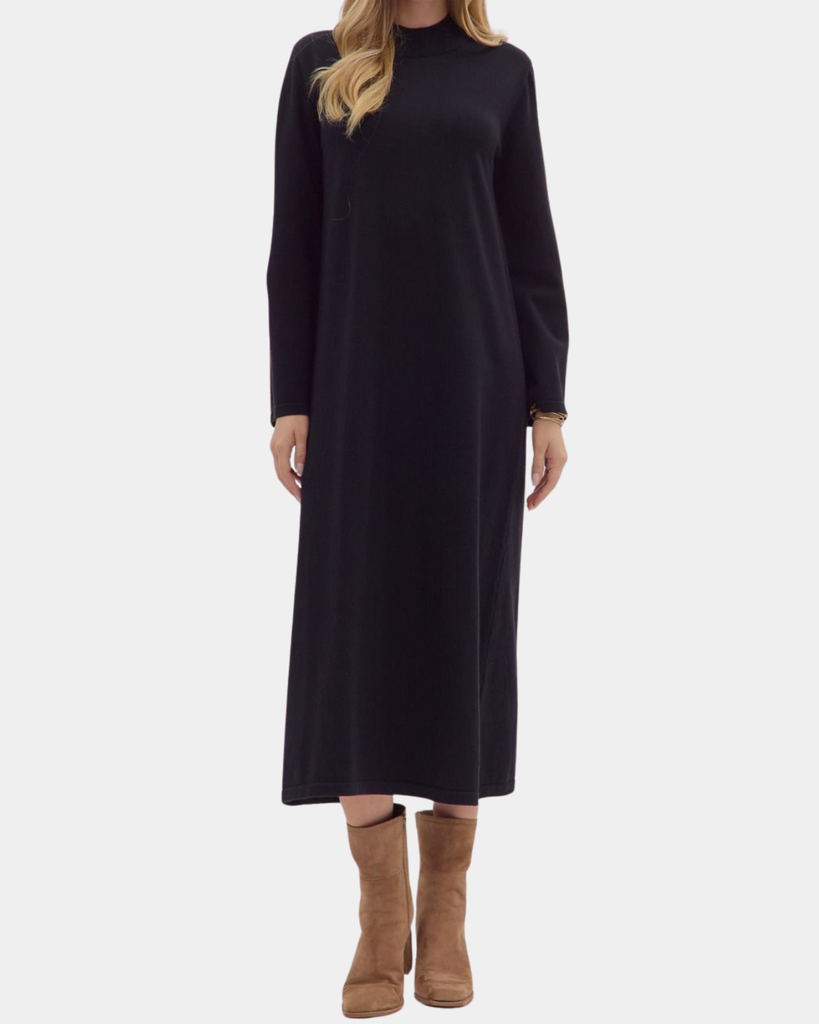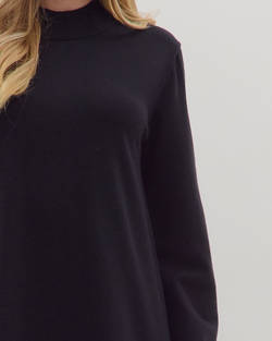 Elevate your style effortlessly with this sleek black mock neck sweater dress, perfect for any occasion. Its midi length and cozy fabric promise a graceful silhouette that’s as comfortable as it is chic.