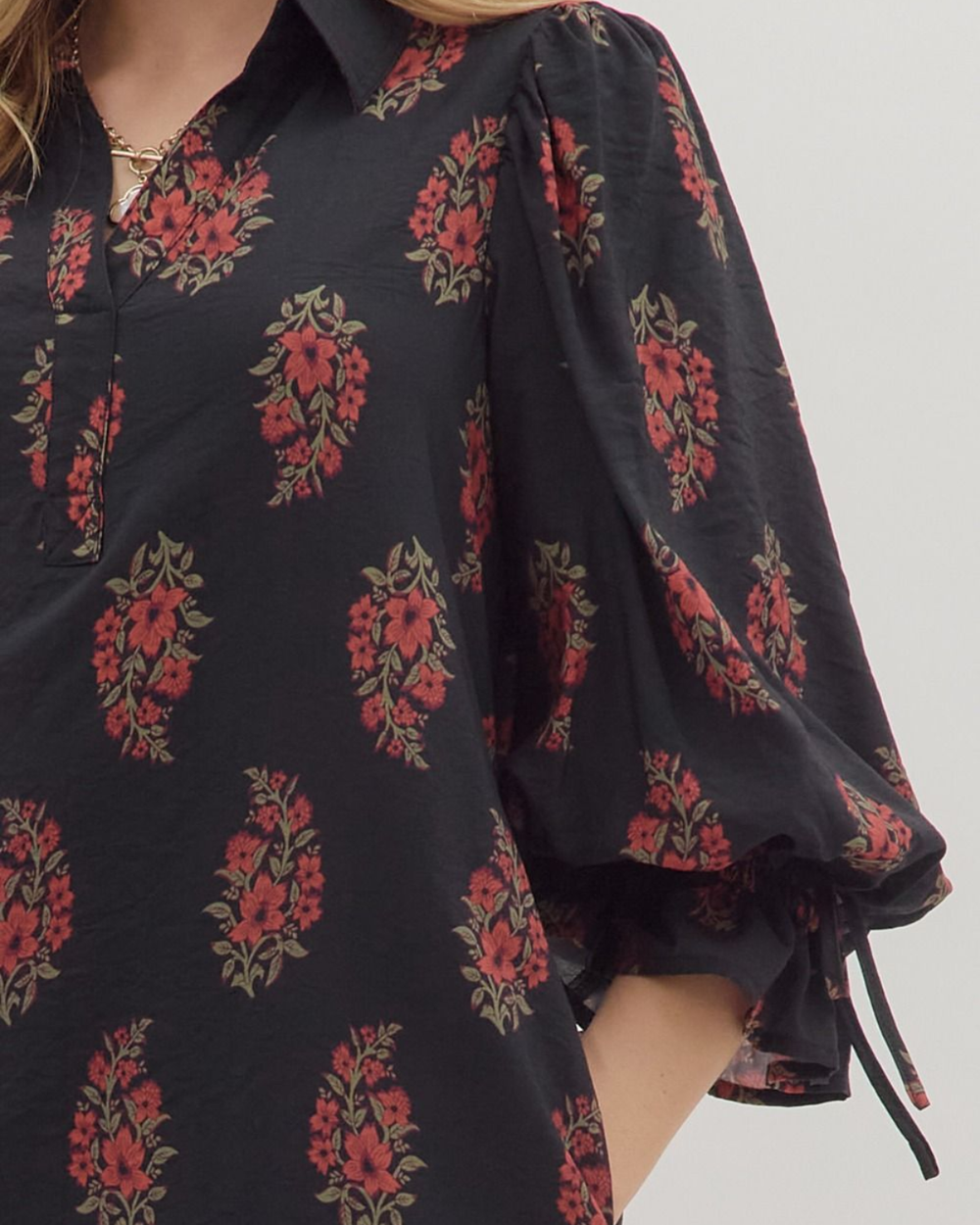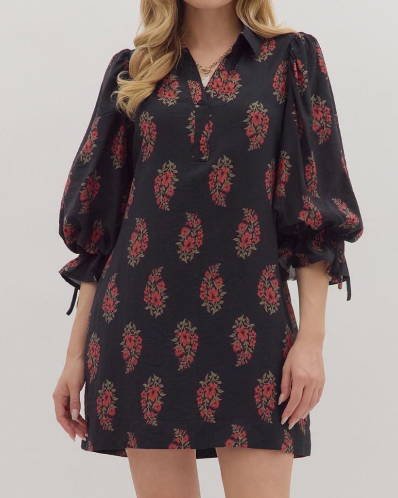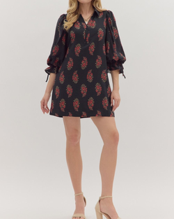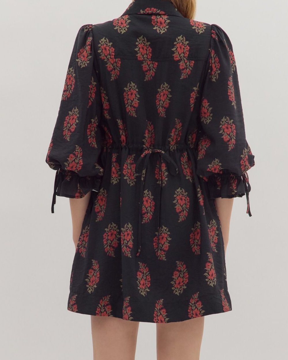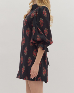 This playful black floral mini dress features charming puff sleeves for a flirty, fun look. Perfect for turning heads at any casual outing or event.