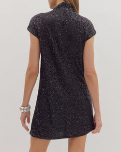 This black sequin mini dress offers a refined silhouette with its short sleeves and flattering hemline, perfect for elegant evening occasions.