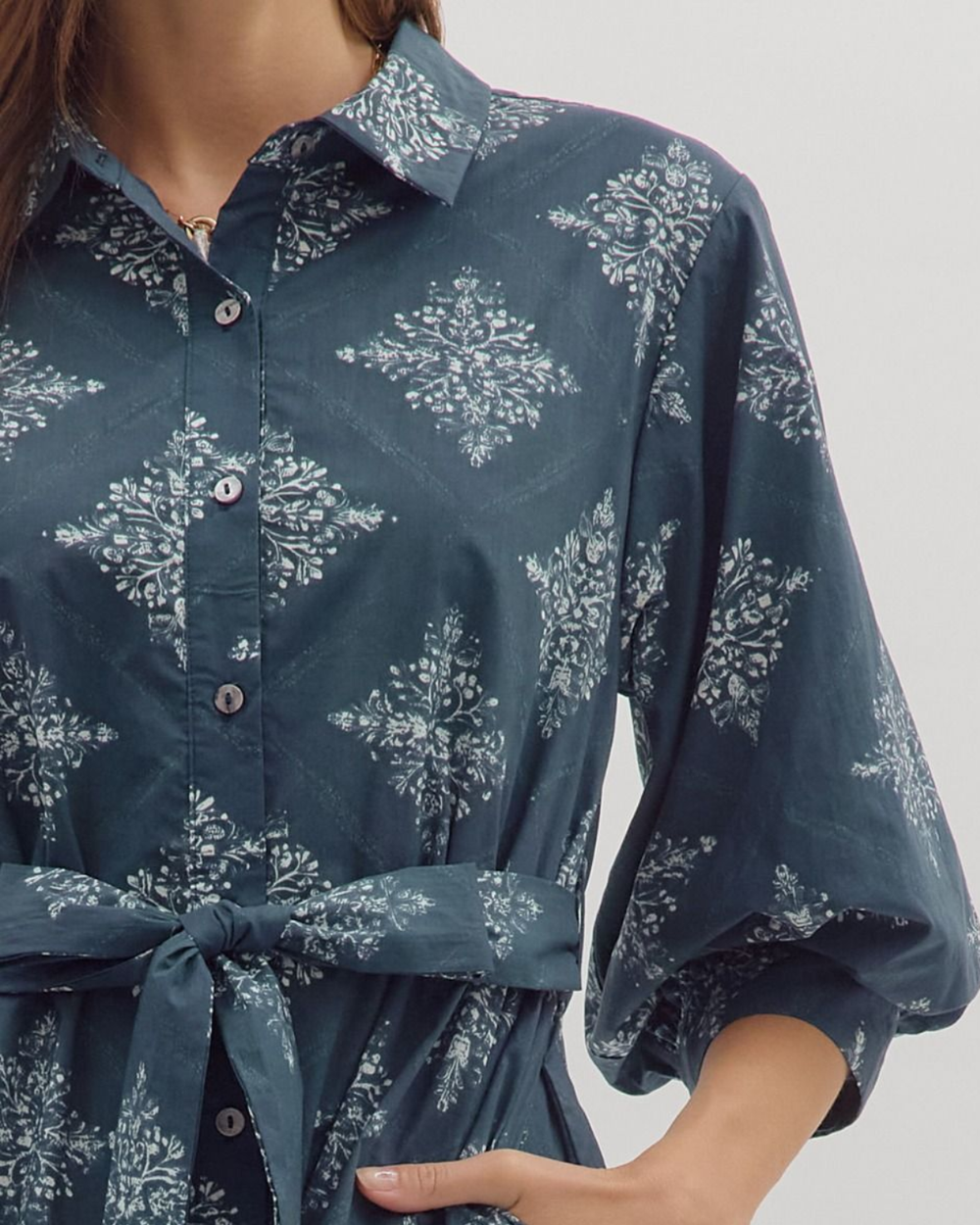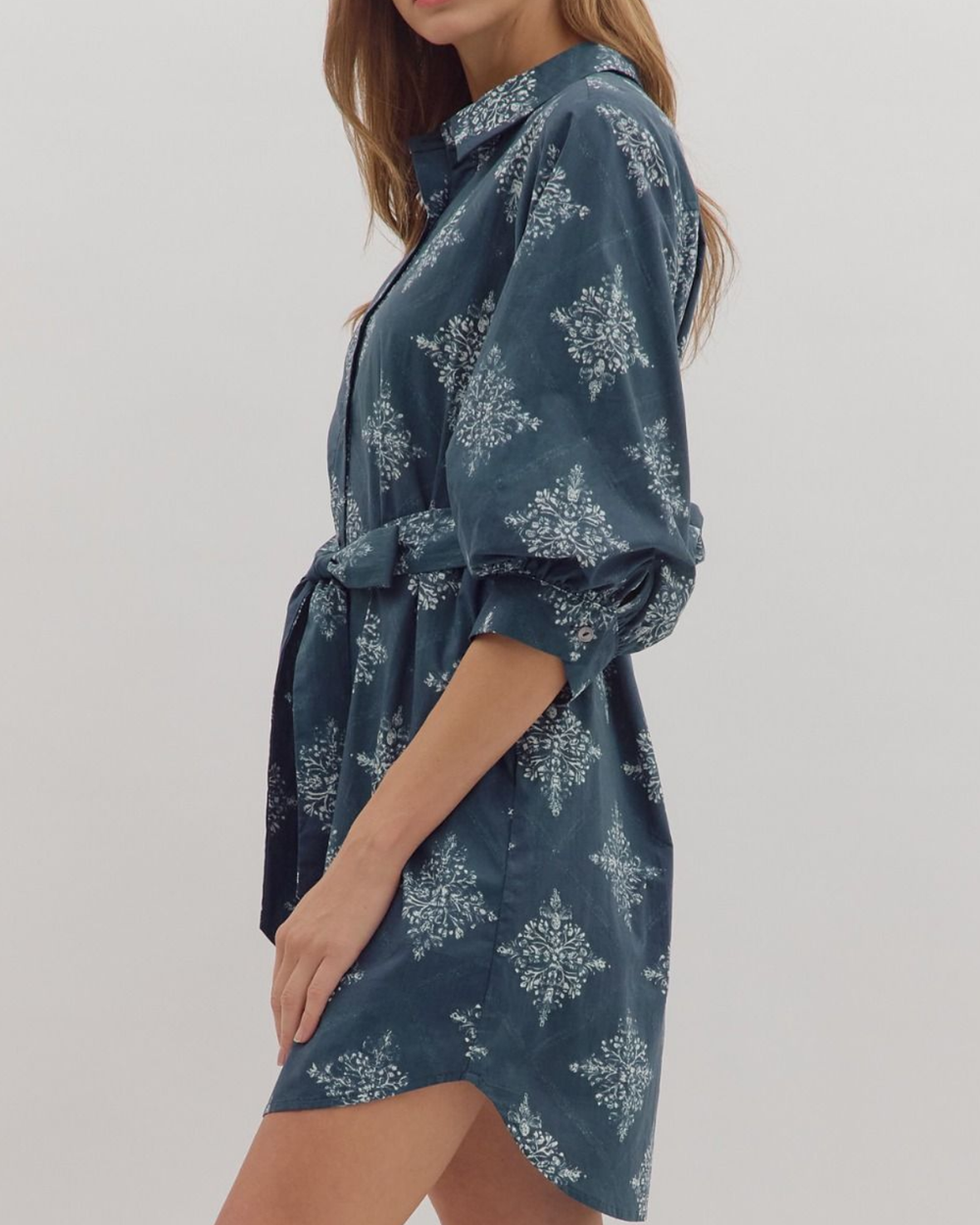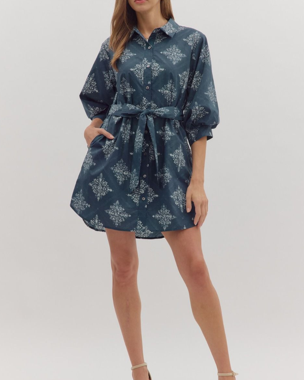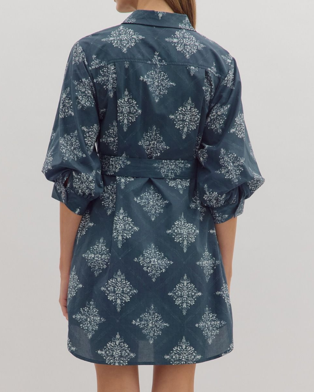 This navy medallion print mini dress mixes fun flair with effortless style, featuring a crisp collared neckline and detachable waist tie.