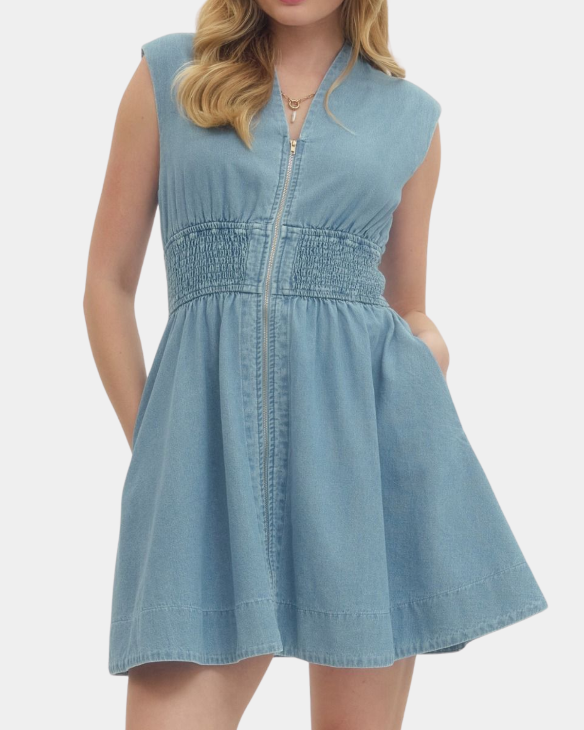 Zip into fun with this denim mini dress that's ready for anything. The sleeveless cut keeps things breezy, while the smocked waist hugs you just right.