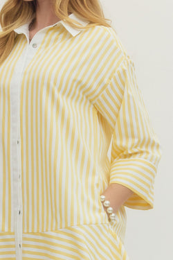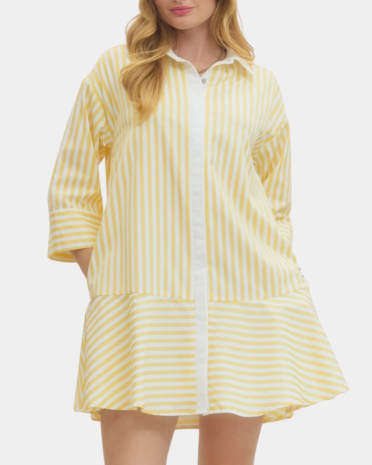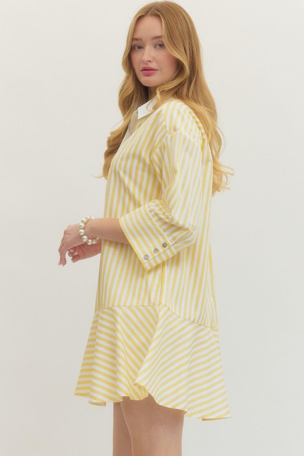 Stripes meet style in this charming mini dress! The crisp collared neckline and 3/4 sleeves keep things polished, while contrast placket and cuff details add a fun pop.