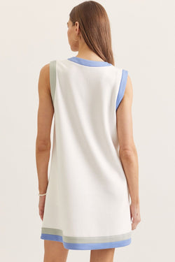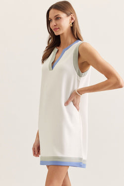 This sleeveless mini dress showcases a flattering V-neckline accented with contrast trim that adds visual interest without compromising elegance. Versatile enough for casual outings or dressed up for evening occasions.