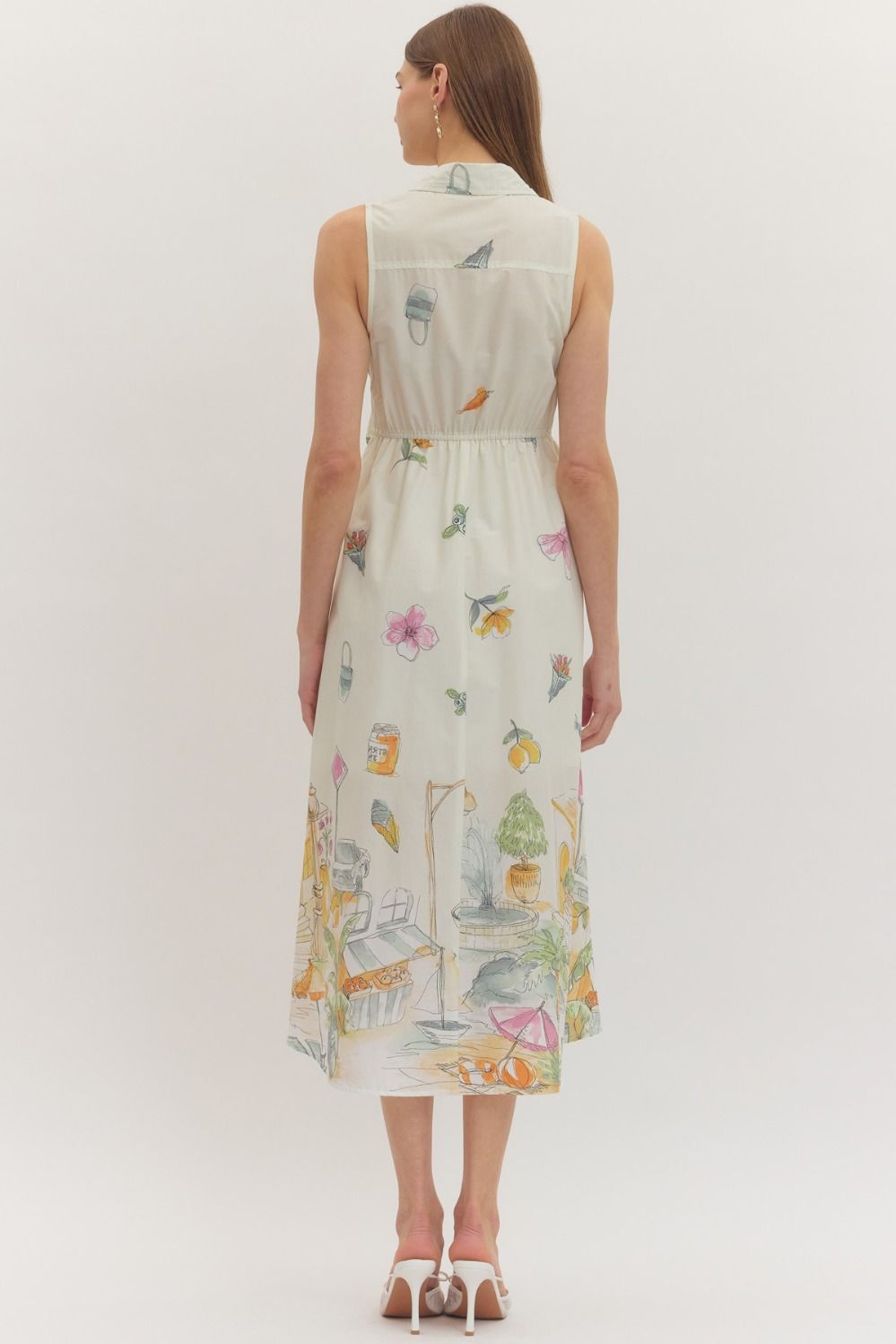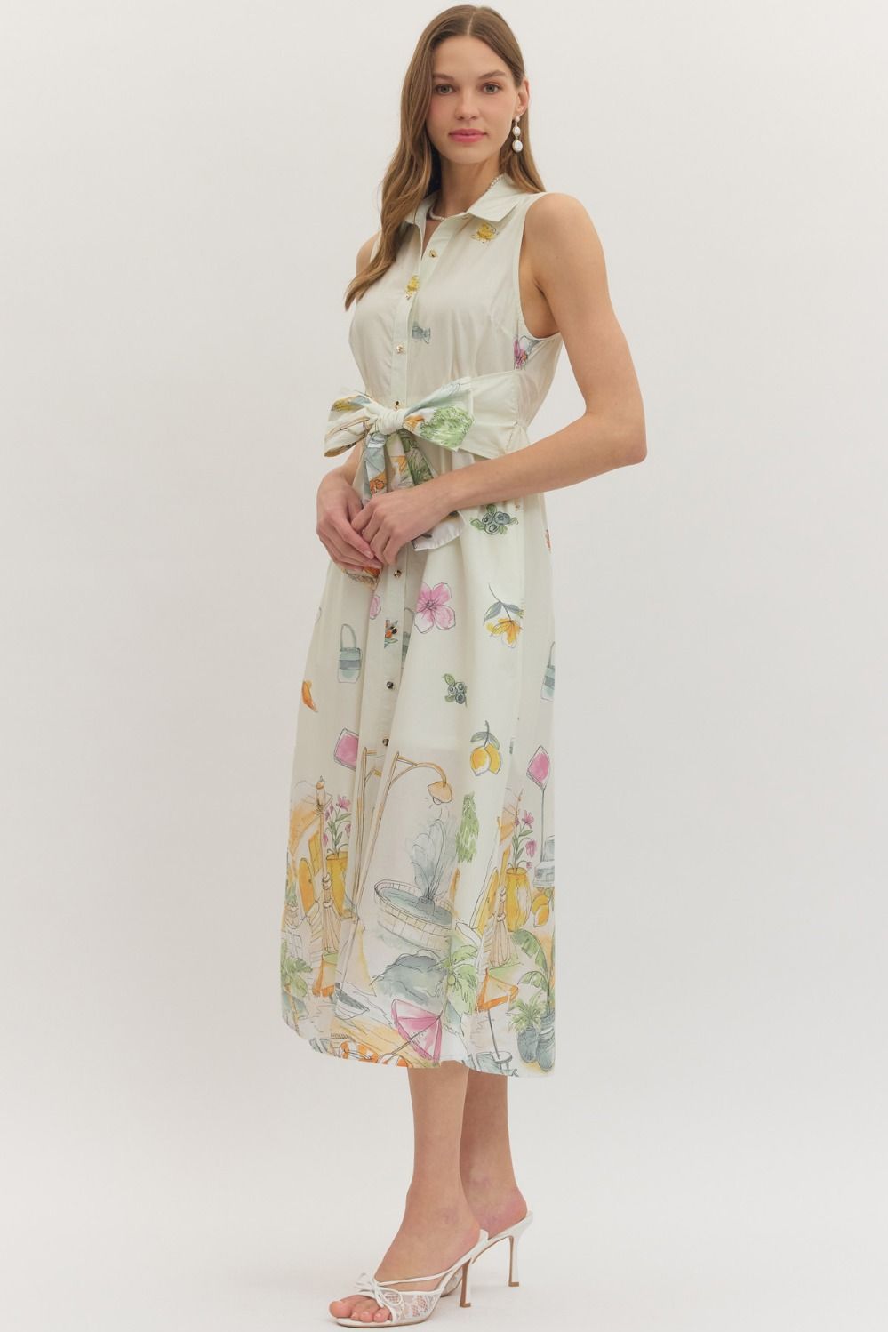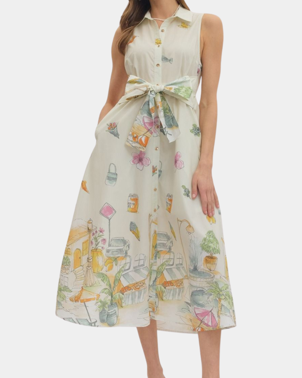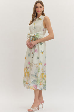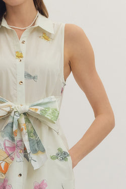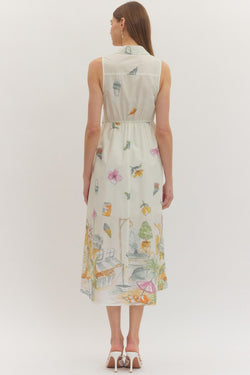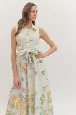 Cream-colored sleeveless midi dress with a charming illustrated novelty print and adjustable self-tie waist. The relaxed fit and playful design make it an instant wardrobe favorite.