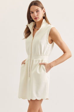 Sleek and chic, this mini dress is ready for anything. The scallop stand collar adds a flirty touch, while the half-zip front keeps things fun and easy.