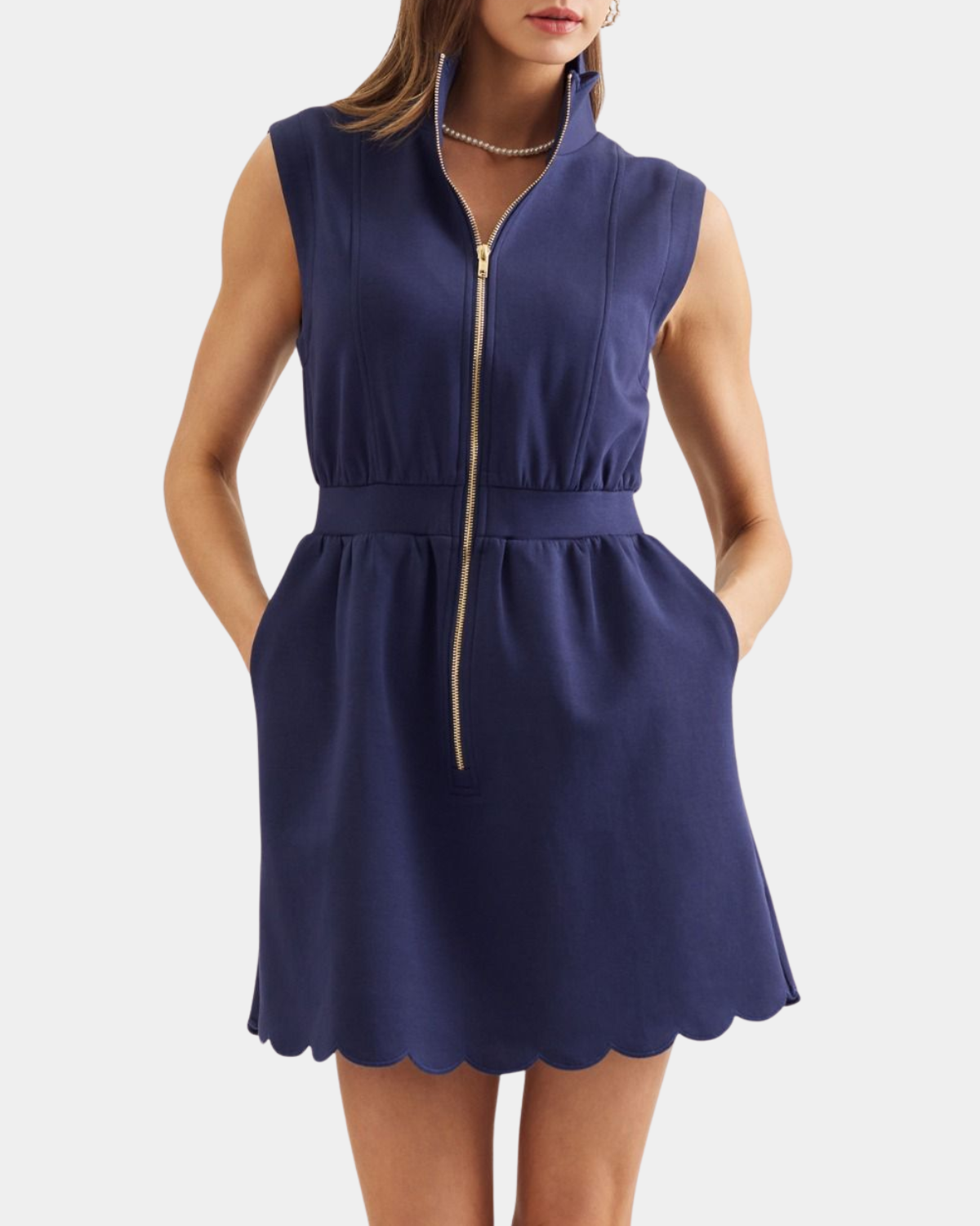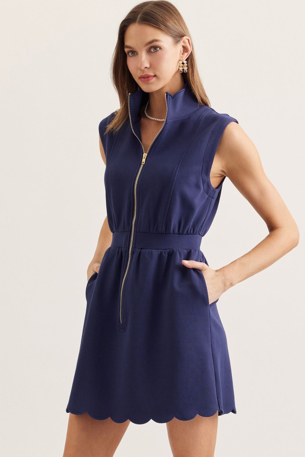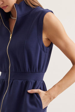 Sleek and chic, this navy mini dress is ready for anything. The scallop stand collar adds a flirty touch, while the half-zip front keeps things fun and easy.