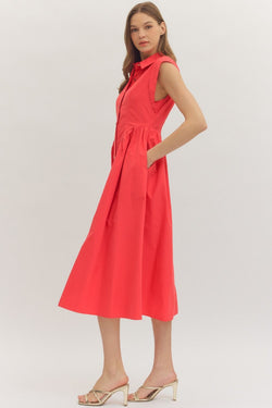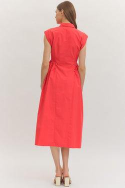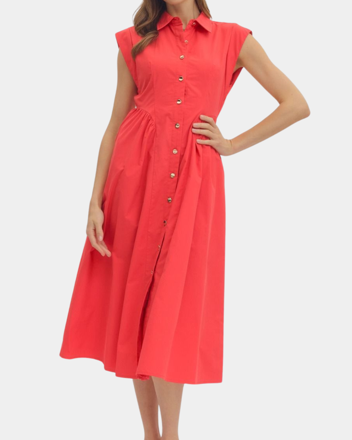 This midi dress combines classic design with contemporary allure. Featuring a sculpted corset waist that enhances your natural curves, paired with graceful cap sleeves and a front button fastening.