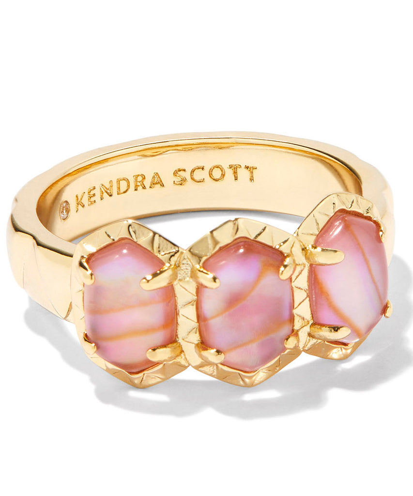 Meet your new stacking obsession, the Daphne Gold Band Ring in Light Pink Iridescent Abalone. Featuring three stunning stones encased in a sleek, textured band, this ring can definitely shine on its own, but it also plays well with your other styles.