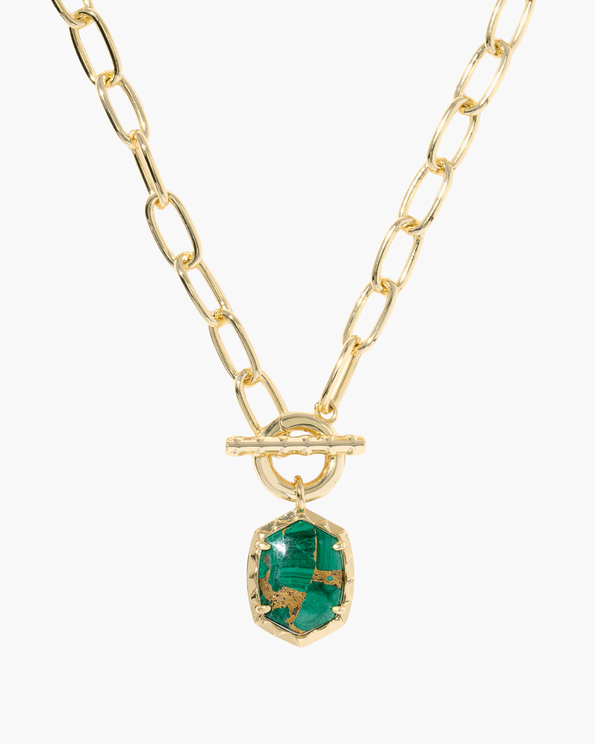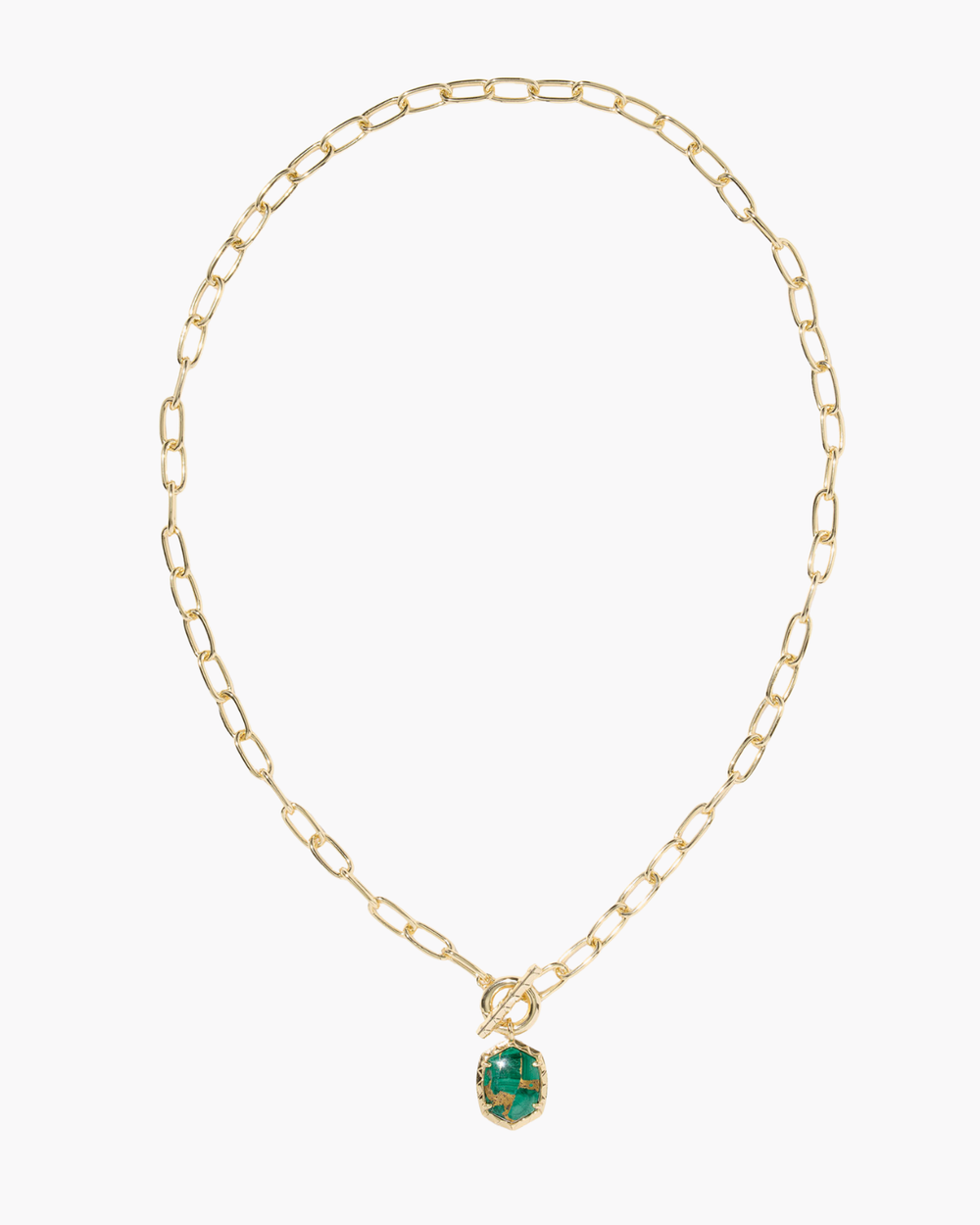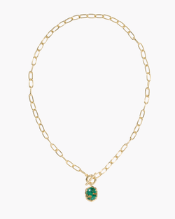 Discover the essential layer in your necklace collection with the Daphne Gold Link and Chain Necklace, featuring a modern oval charm on a trendy paperclip chain with signature hoofprint accents. Its convertible design lets you choose between a vibrant pop of green malachite or a sleek metal look.
