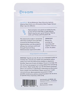 Wearable wellness patches with sustained release of ingredient up to 8-12 hours. Each unit contains 4 patches in a resealable pouch. All patches are vegan, cruelty free, made without latex, and paraben free Made in the USA, with global ingredients Perfect for beauty rest, travel, or even just a good nap. Infused with Melatonin, Hops, and Valerian Root. Ingredients: FINAL SALE - CANNOT BE RETURNED OR EXCHANGED