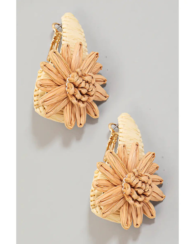 This pair of hoop earrings displays a fashionable raffia braided flower and style. Celebrate the art of accessorizing with this piece that effortlessly encapsulates modern trends.