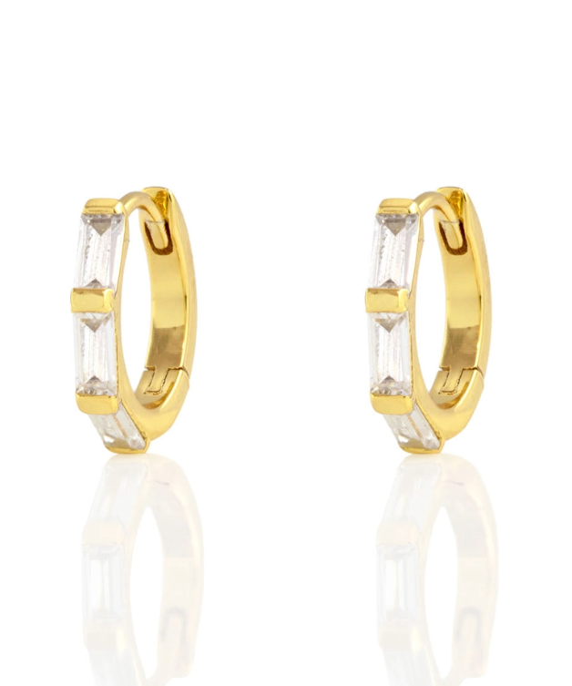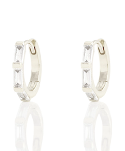 Huggie style hoop earring measure 12mm round. Available in 18K gold vermeil (solid sterling silver with 18K gold plating) or sterling silver with cubic zirconia baguette crystals.