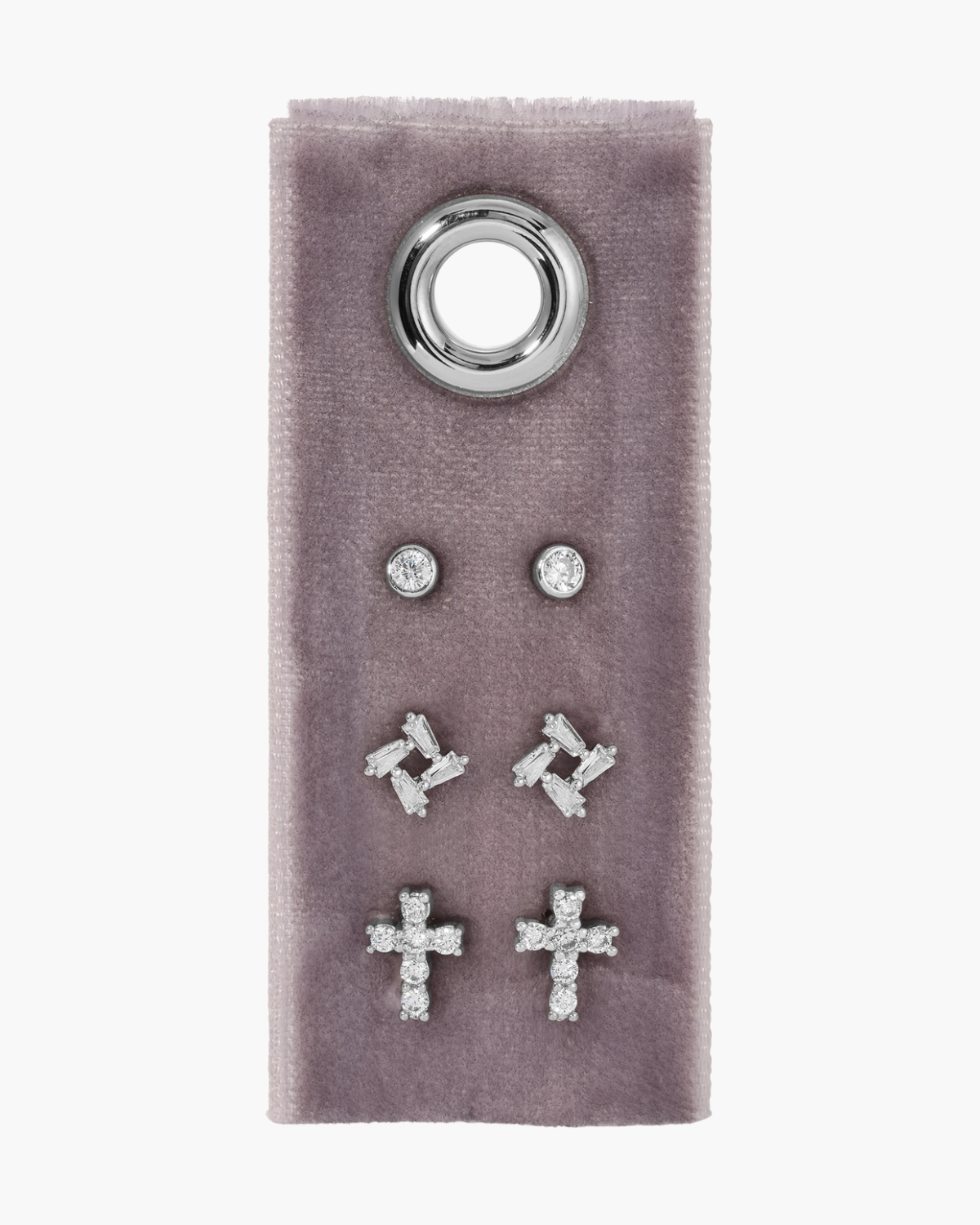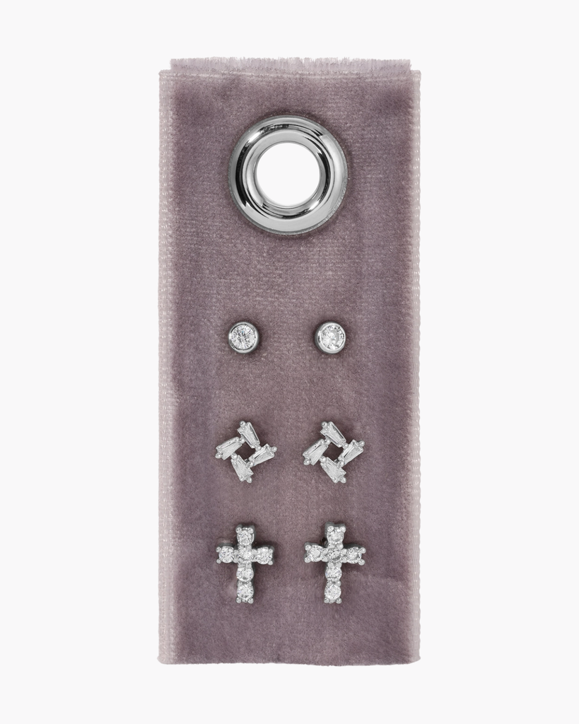 Add a touch of sparkle and edge with this set of three silver studs—featuring a classic cross, a dazzling CZ cluster, and a sleek single CZ. Perfect for mixing, matching, and showing off your playful style every day!