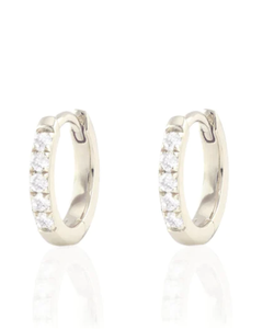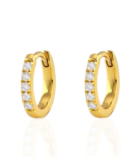 Huggie style hoop earrings measure 12mm round. Available in 18K gold vermeil and sterling silver. Pave setting with crystal cubic zirconia crystals.
