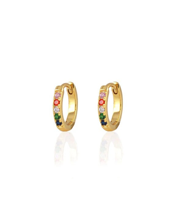 Add a fun pop of color to your outfit with these Kris Nations Rainbow Crystal Huggie Hoop Earrings! Made with vibrant 12mm crystals and a gold hoop, these earrings are sure to make a statement. Perfect for adding a touch of playfulness to any look.