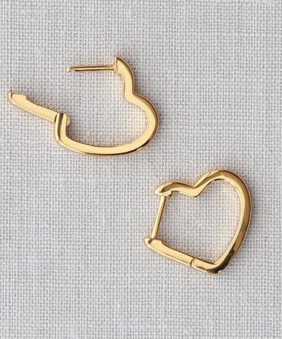 Open heart huggie style hoop earrings measure 15mm. Hinge closure. Available in 18K gold vermeil.