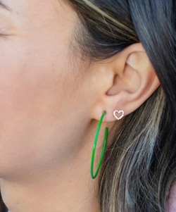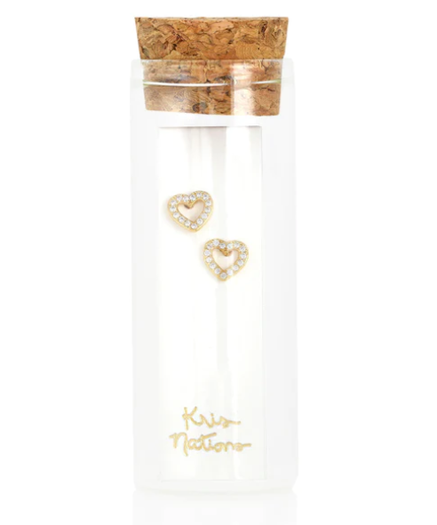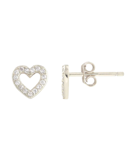 Heart outline stud earrings in a pave setting with cubic zirconia crystals.