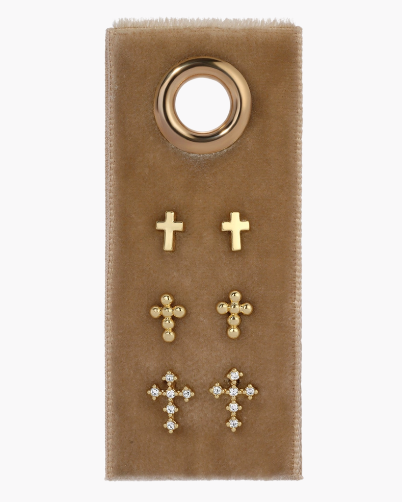 Add a touch of sparkle and charm with this playful set of three gold cross studs—featuring cubic zirconia, ball, and plain designs. Perfect for mixing, matching, and showing off your style with a wink!