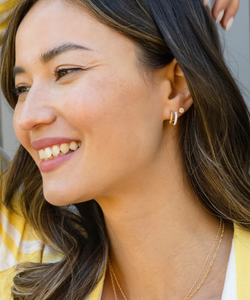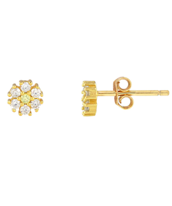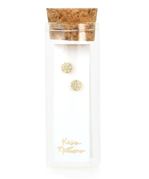 Daisy flower stud earrings in a pave setting with cubic zirconia crystals. The center is a yellow crystal. The perfect everyday studs.