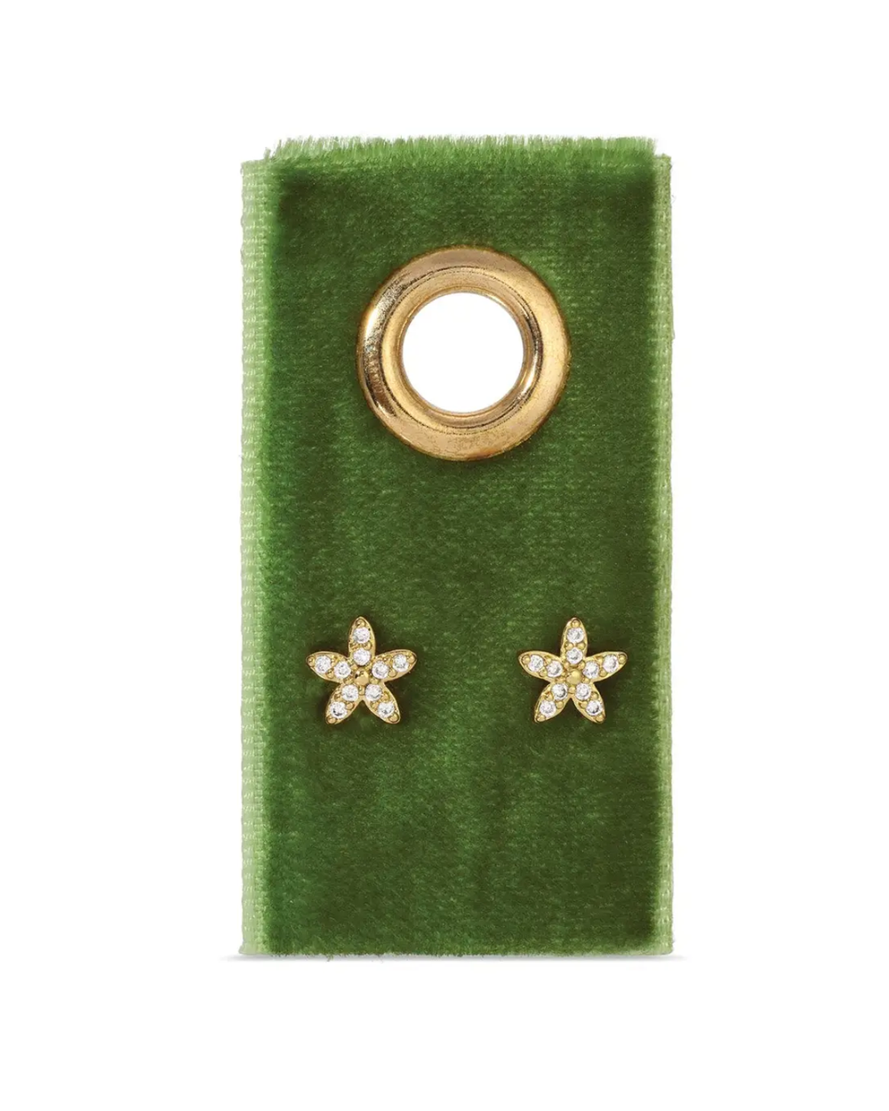 Add a touch of sparkle with these playful pave flower studs, perfectly set on a soft velvet tag. These gold beauties bring fun and elegance together in one charming duo.