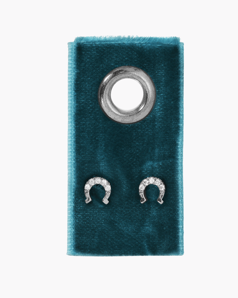 Brighten your day with these charming silver horseshoe studs, adorned with sparkling pave accents. Presented on a soft velvet tag, they're a playful touch of luck for any outfit.