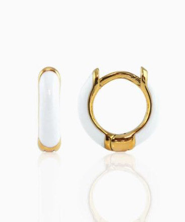 These enamel huggie hoop earrings hug your ear perfectly and bring gorgeous saturated color to your ear party. They open and close easily with a hinge component. Available in white & 18K gold vermeil. Hoops measure 11.25mm outside diameter.