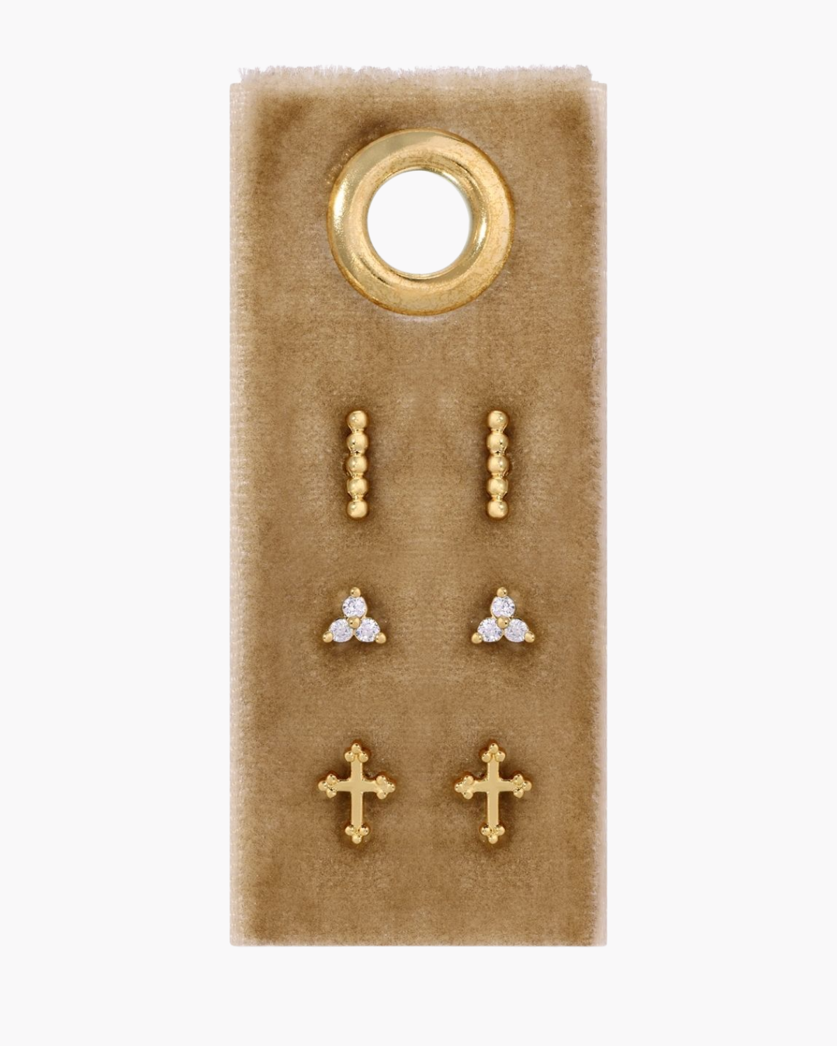 Add a little sparkle to your day or gift a dazzling surprise with our Cross Accented Stud Set, perfectly packaged on a velvet gift tag! This fun trio pairs sleek minimalism with charming details—featuring a dotted bar, a trio of shimmering CZs, and a sweet little cross to mix, match, and stack however you like.