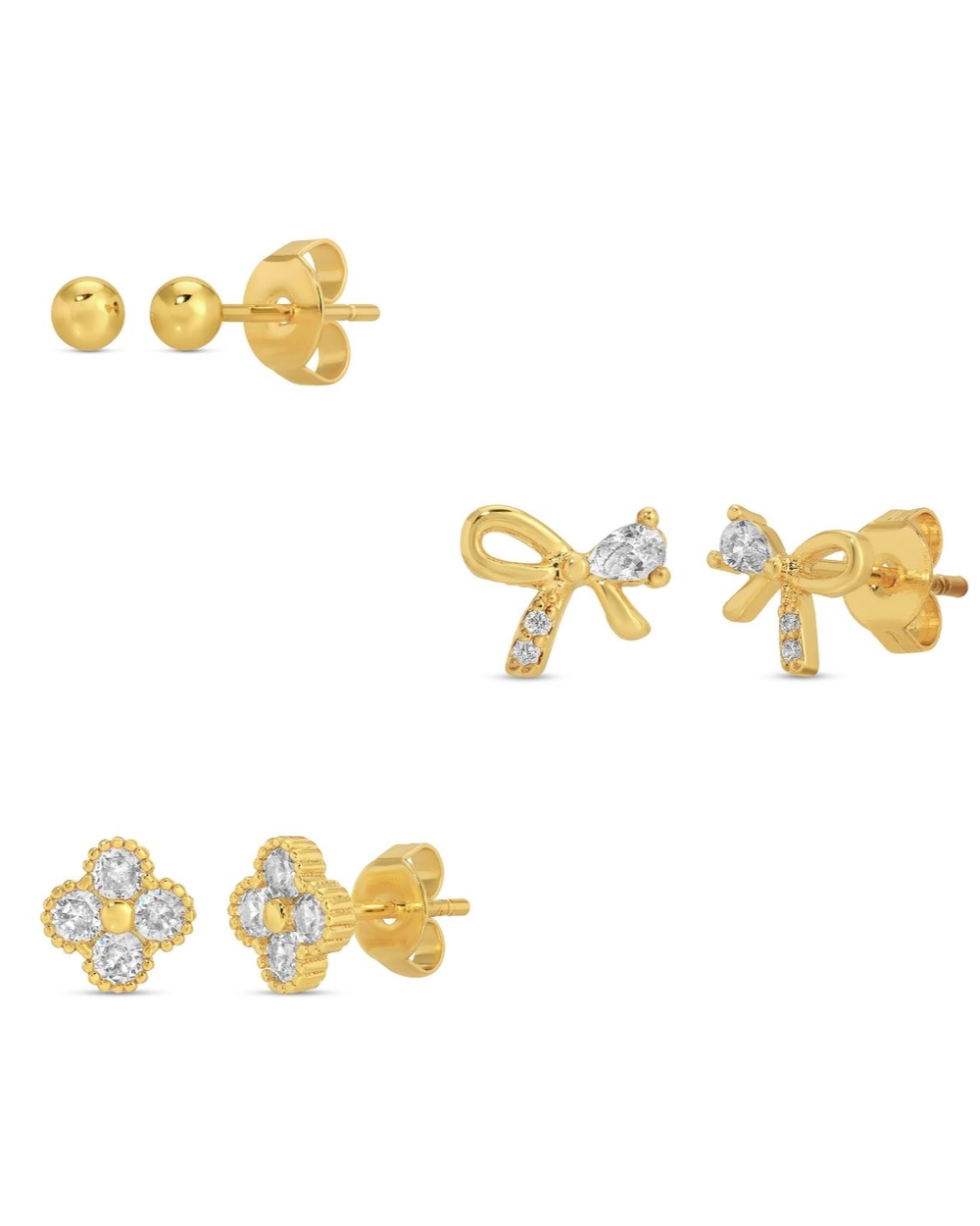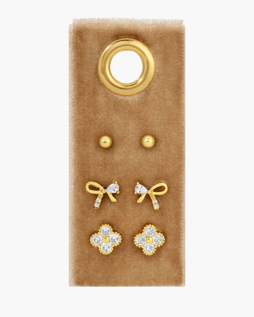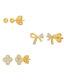 Give your ears a fun and sparkling upgrade with our Set of 3 Bow Accented Studs, mixing classic balls, dazzling bows, and lucky clovers all in one playful pack. These lightweight, gold-plated studs are perfect for stacking or solo wear, letting you mix, match, and shine your way every day!