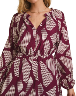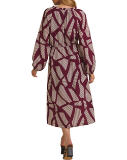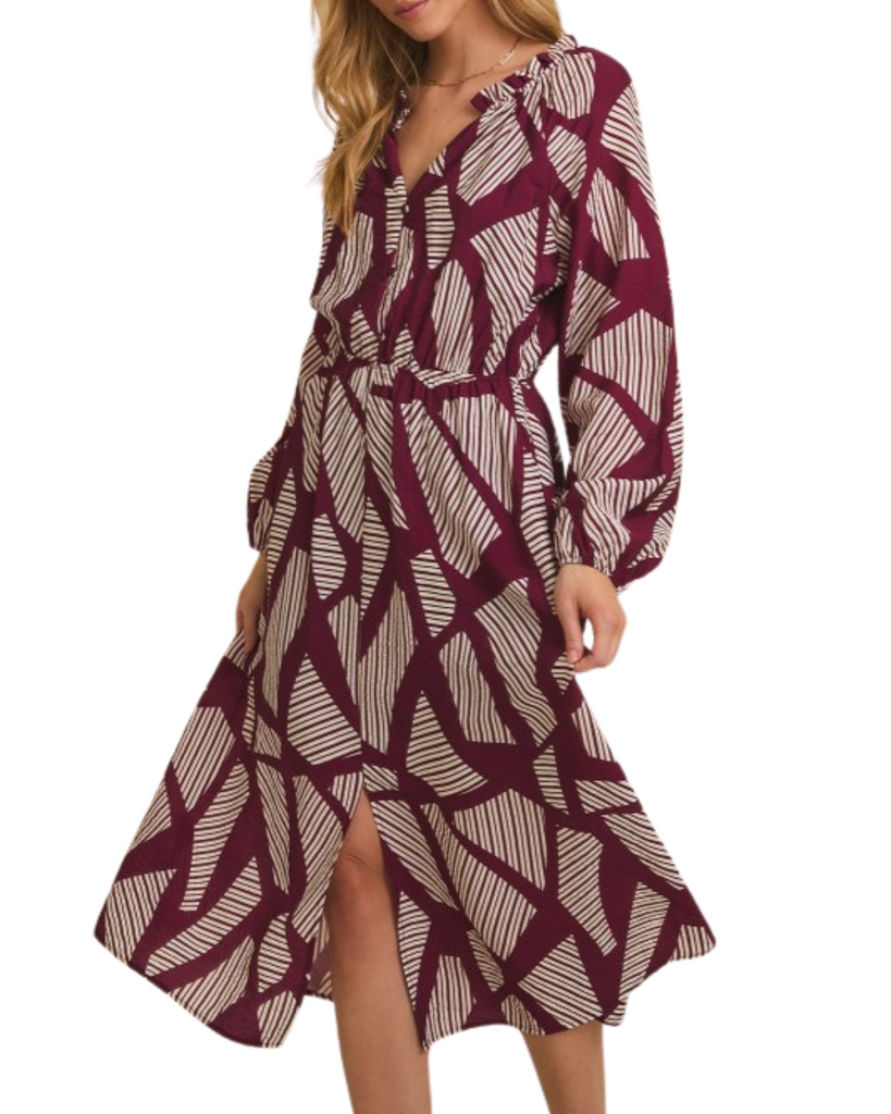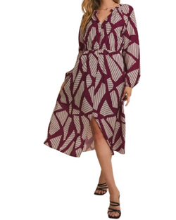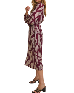 Step out in style with this playful button-up midi dress, featuring a lively wine and white abstract print and long sleeves. It's the perfect mix of fun and sophistication to brighten up any occasion.