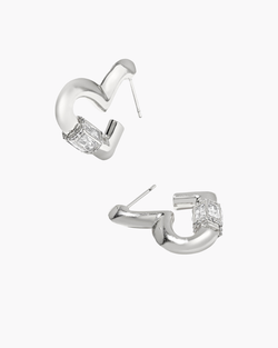 Enhance your ear stack with the Emery Heart Silver Hoop Earrings, featuring a polished metal finish inspired by the iconic Ari silhouette. These heart-shaped hoops are accented with baguette stones for a subtle yet striking sparkle.