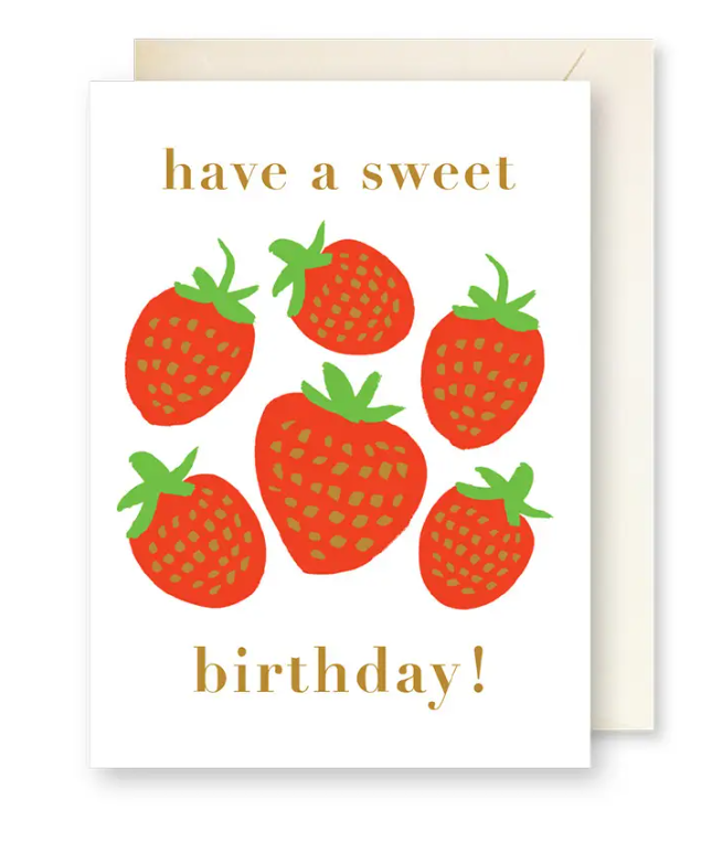 This sweet little birthday card, with its strawberries and type picked out in gold foil, is the perfect addition to any gift..