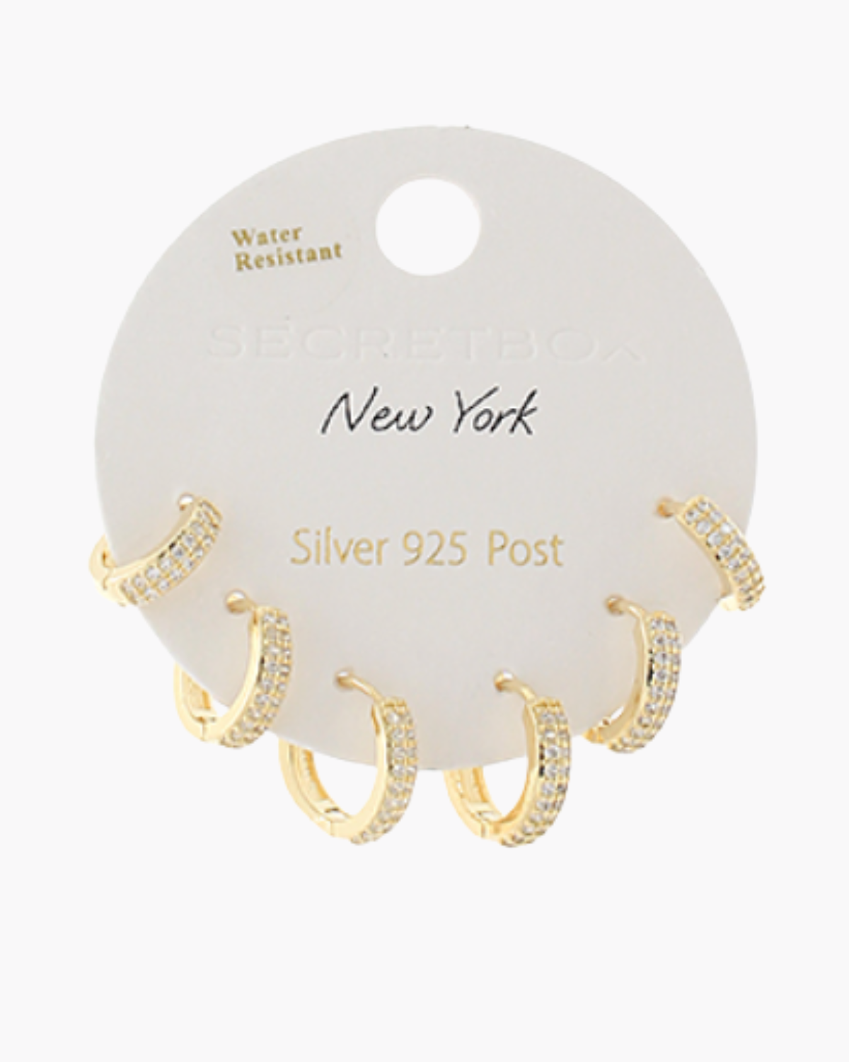 Sparkle in triple threat style with this dazzling huggie hoops set. Each pair features shimmering pave crystals that catch the light from every angle, giving you that effortless glam. Mix, match, and stack them for endless ear-styling possibilities.