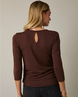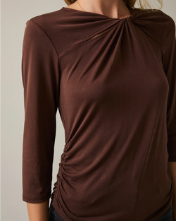 This mocha top combines modern sophistication with thoughtful design details. The twisted neckline frames the silhouette beautifully, while side shirring adds subtle texture and dimension.