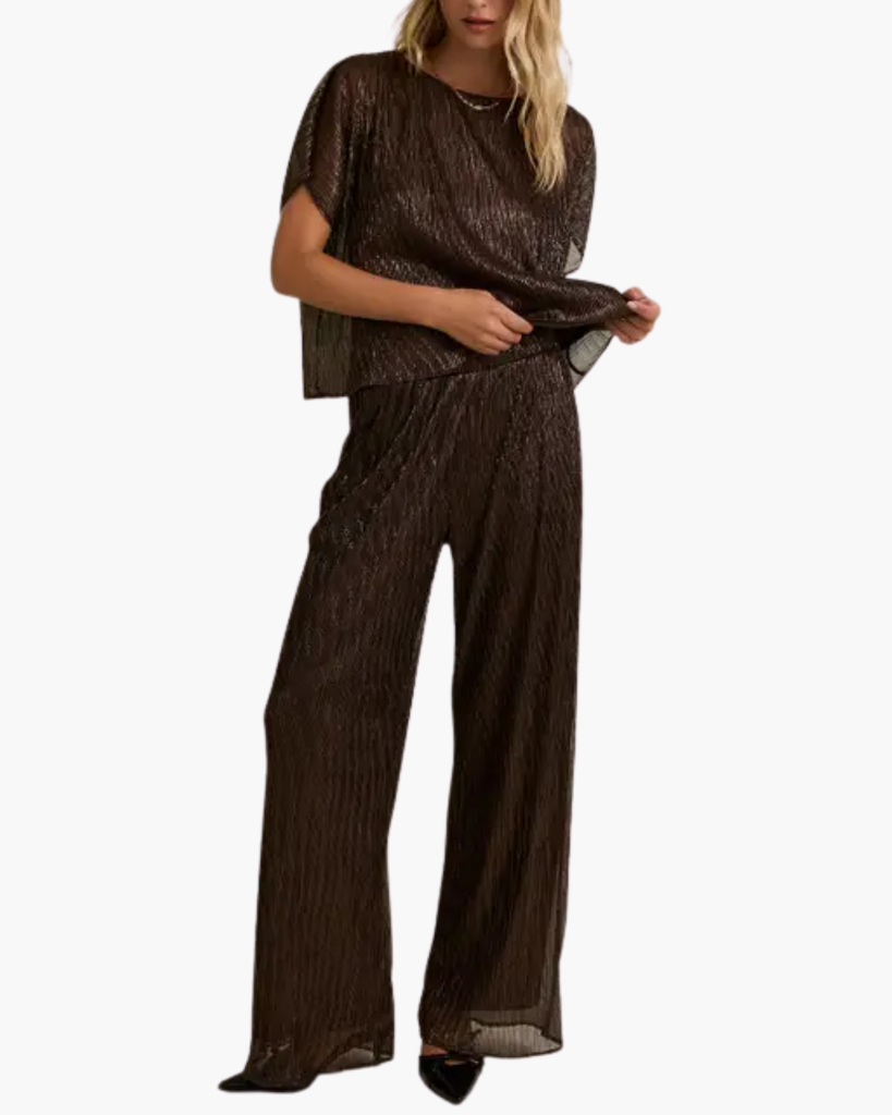 The Coco features a shimmering top paired with sleek matching pants, perfect for turning heads at any occasion. Dress it up or down—either way, you'll be absolutely radiant.