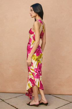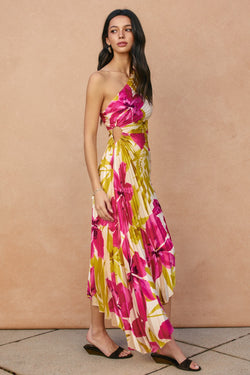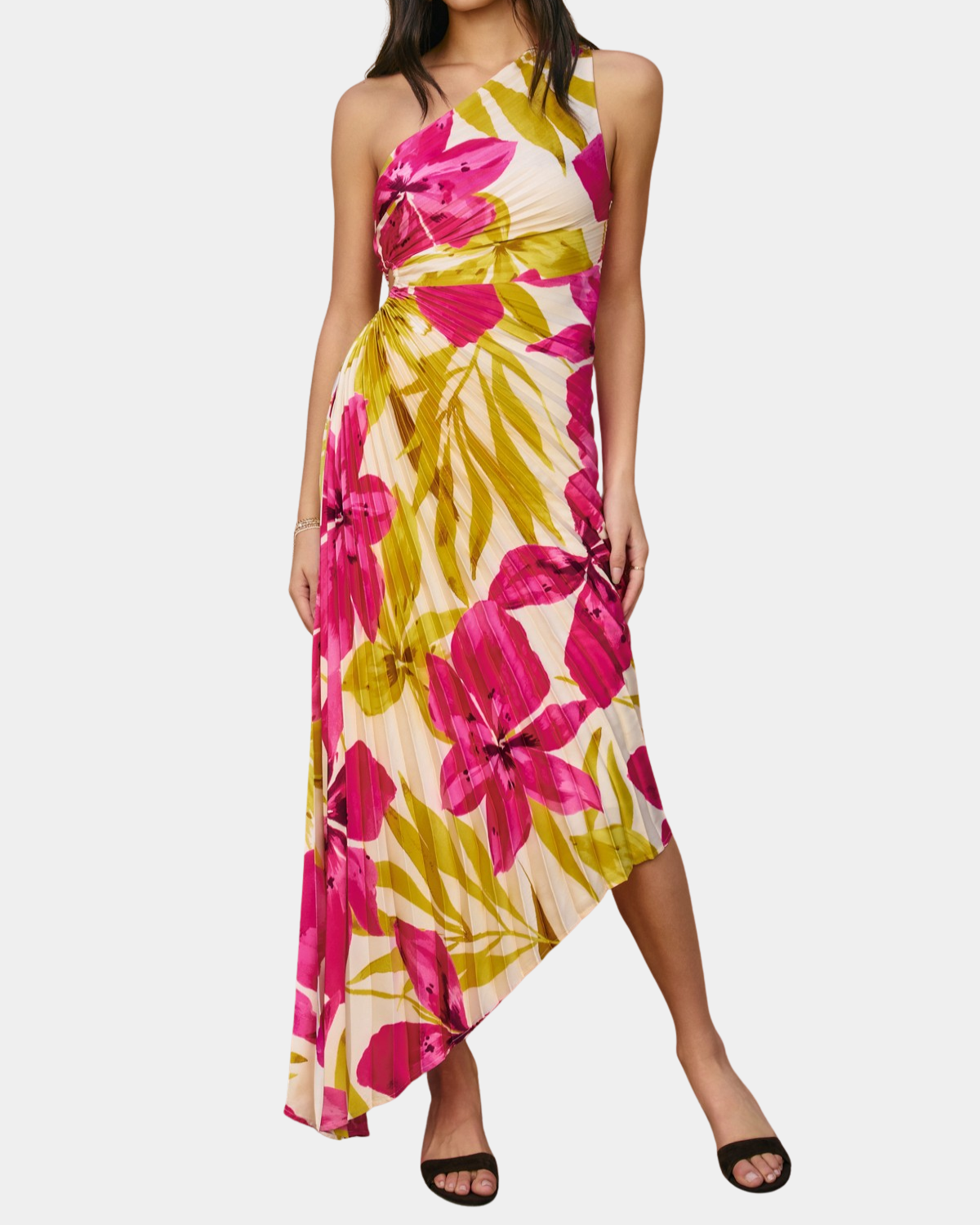 Elevate your evening wardrobe with this stunning asymmetrical pleated maxi dress. Crafted from luxurious floral satin, the graceful pleating and off-balance silhouette create an effortlessly modern aesthetic.