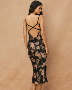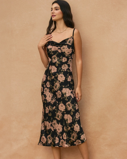 This flirty midi dress combines a dreamy floral print with a chic cowl neck and a bold criss-cross open back—the perfect blend of elegance and edge for any occasion.