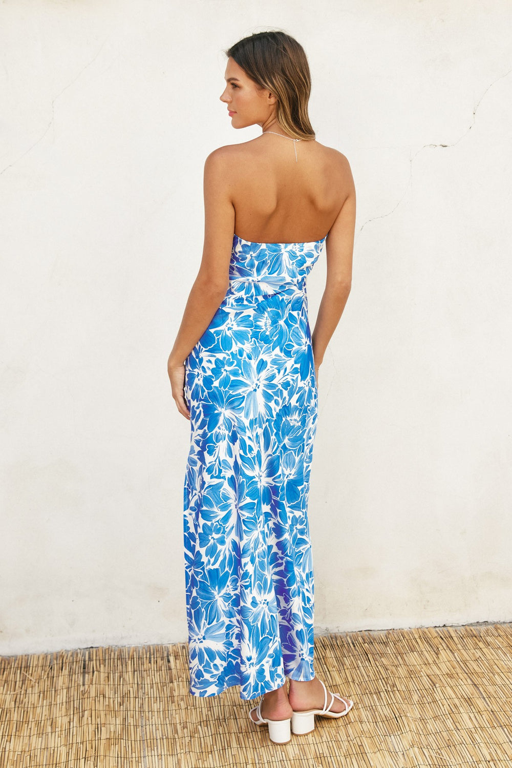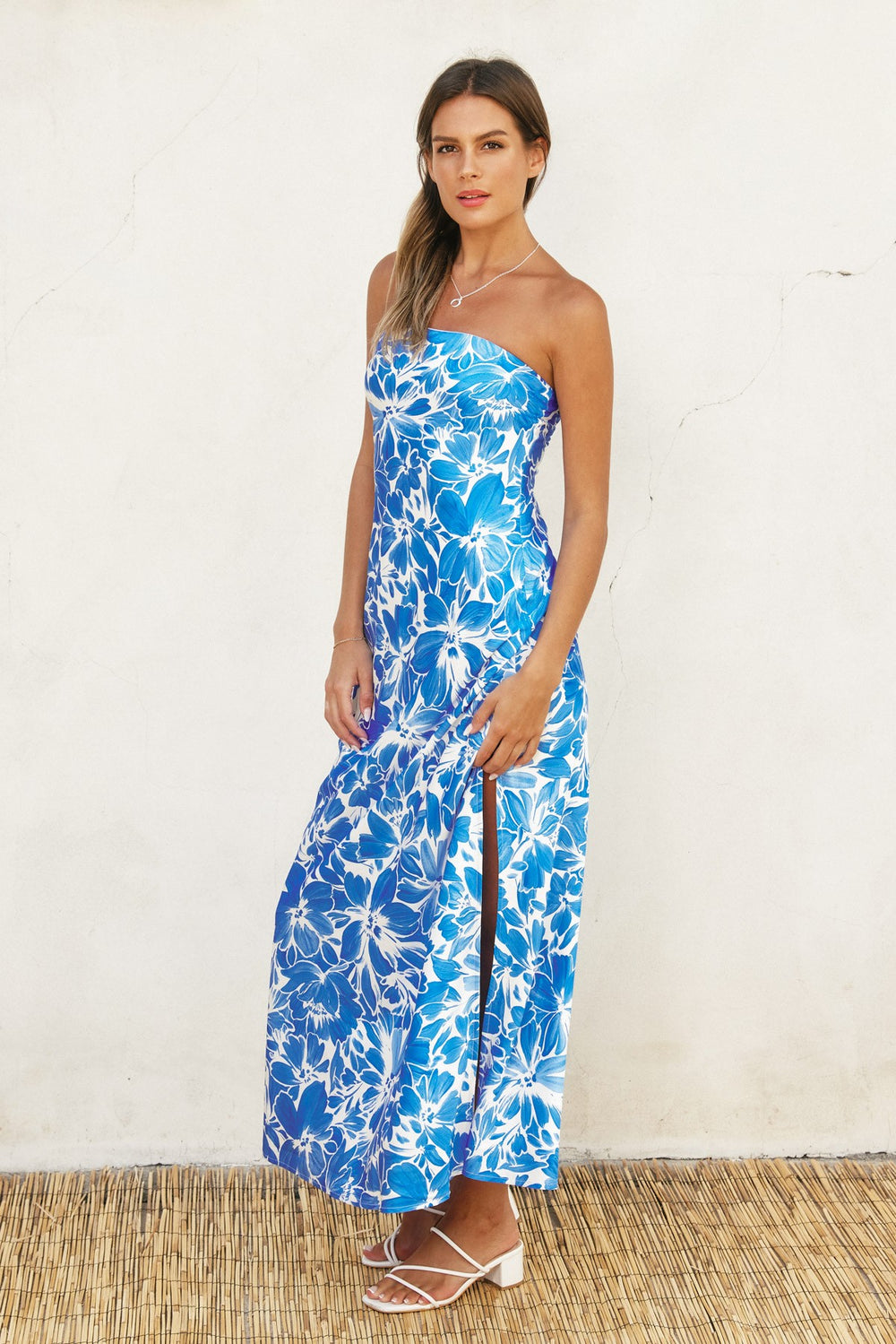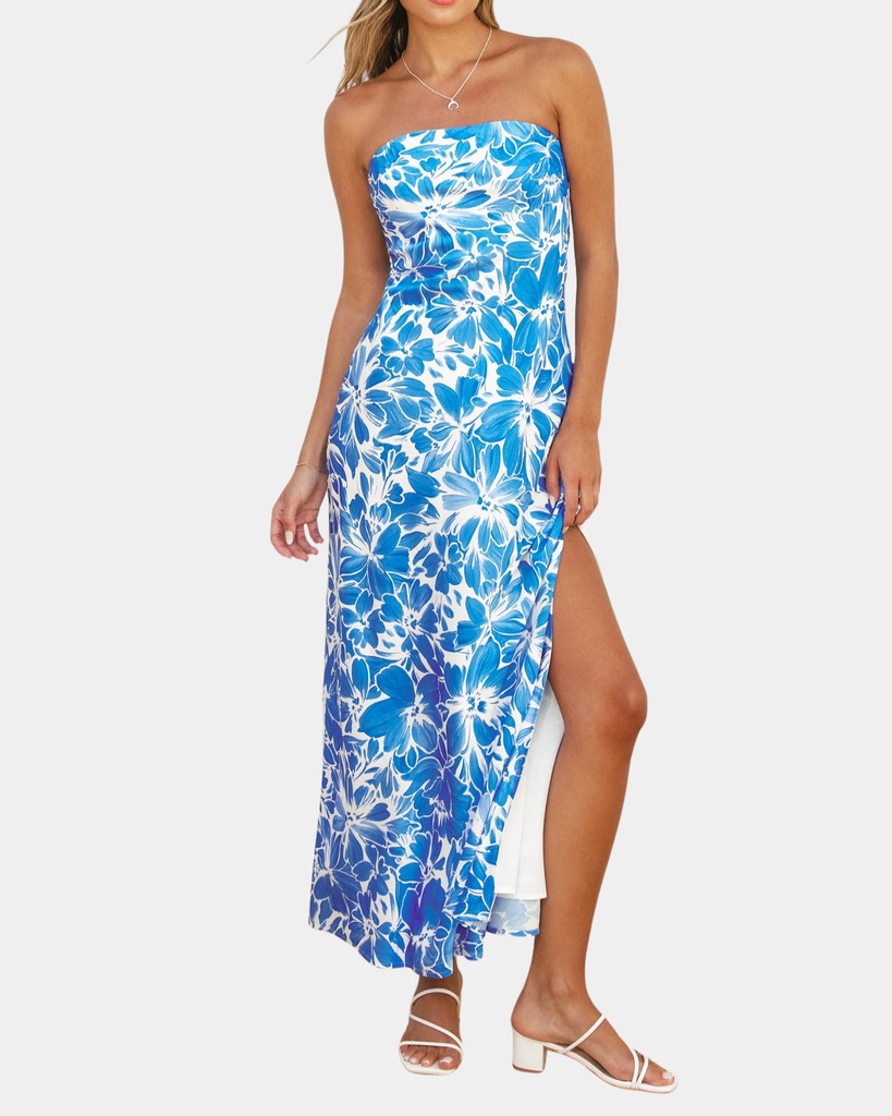 This enchanting strapless maxi dress is pure elegance with a fun twist. Silky satin showcases a gorgeous floral print that catches the light beautifully, while the strapless cut keeps things chic and modern.