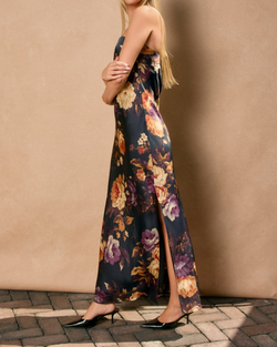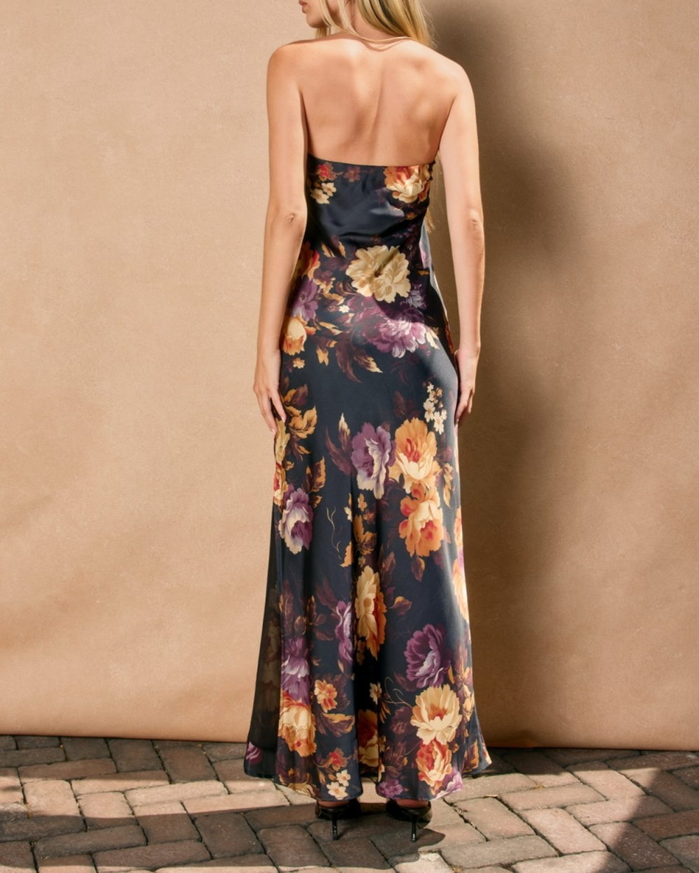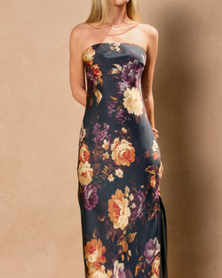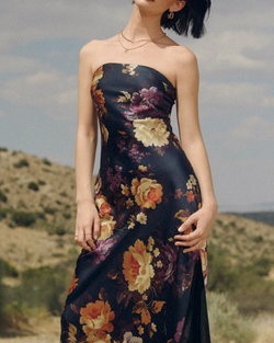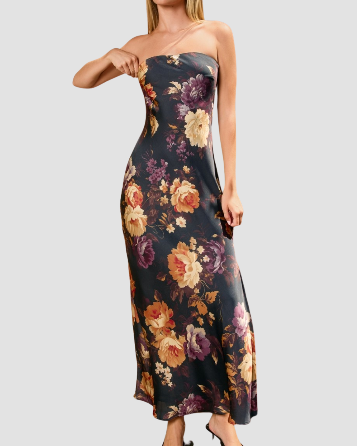This strapless maxi dress in delicate chiffon features an elegant floral print that captures timeless sophistication. Its flowing silhouette and refined design make it perfect for any evening occasions.