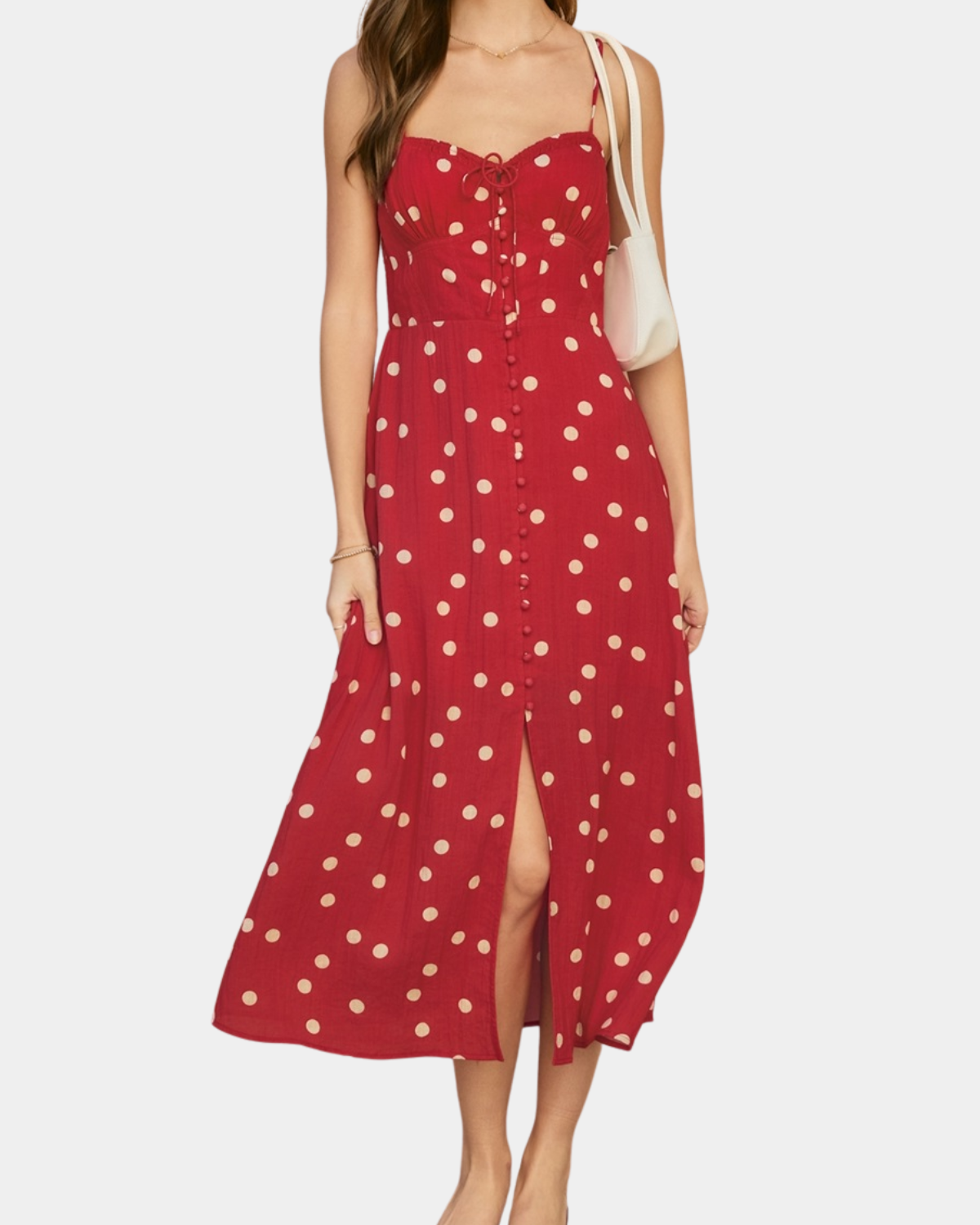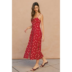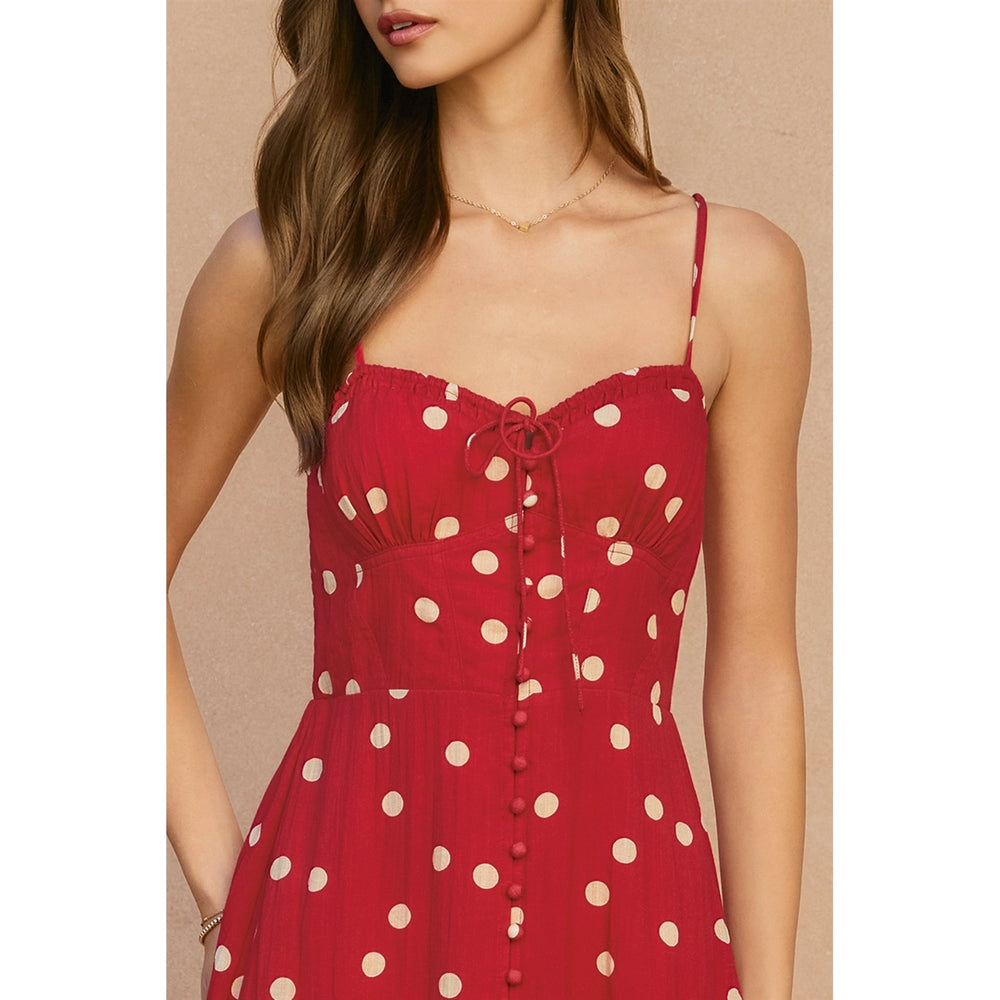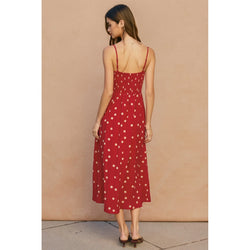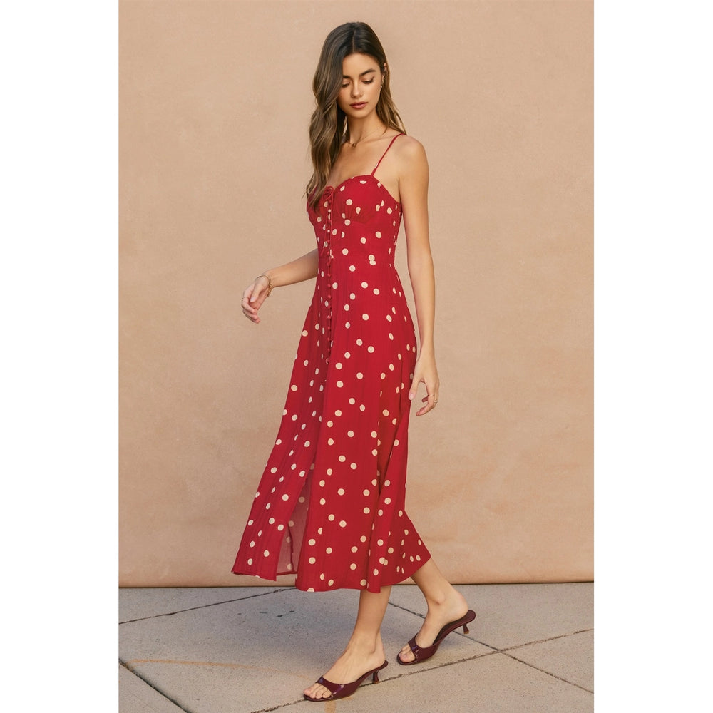 This elegant midi dress features a romantic sweetheart neckline paired with a structured corset-style bodice, all adorned with a timeless polka dot pattern. Perfect for special occasions or elevated everyday wear.