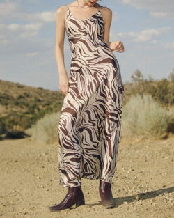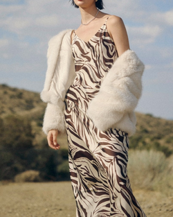 This playful animal print maxi dress features a clean bias cut that flatters every curve. Button details on the back add a fun and stylish finishing touch.