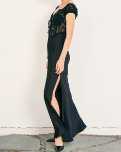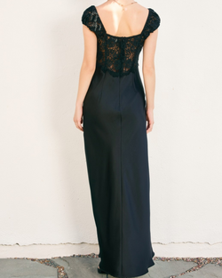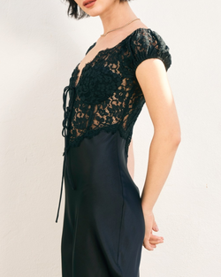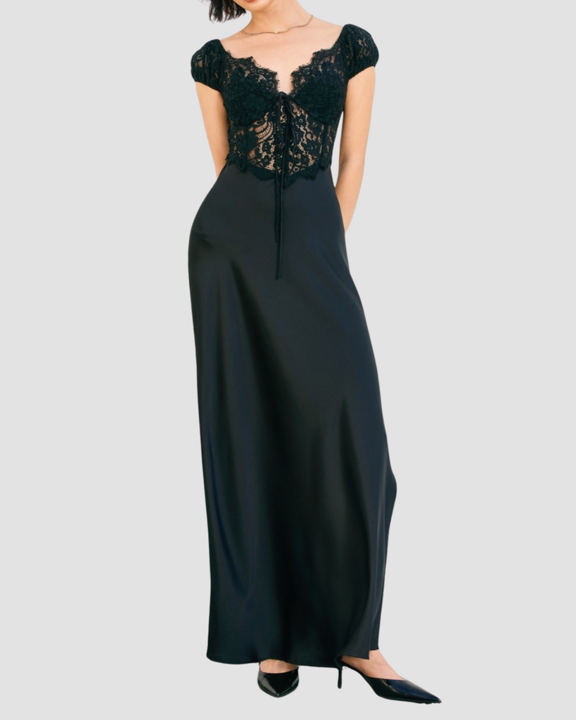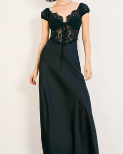 Elevate your evening with the Sweet & Spicy Lace Satin Maxi Dress in black, featuring a delicate see-through lace bodice that exudes refined elegance. The smooth satin fabric drapes gracefully, creating a timeless silhouette.