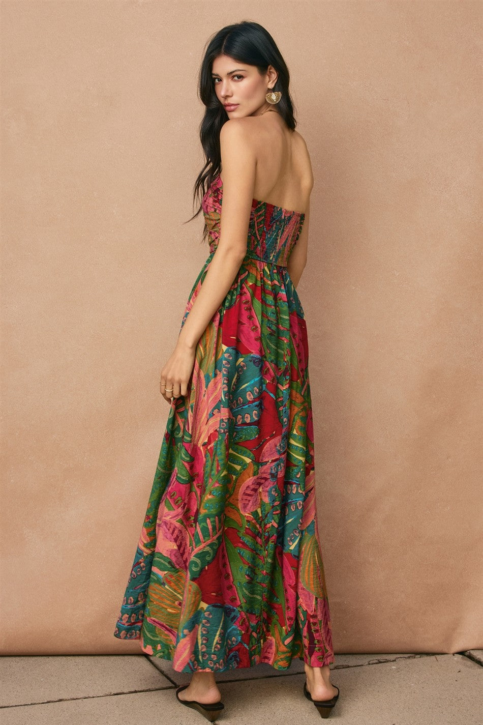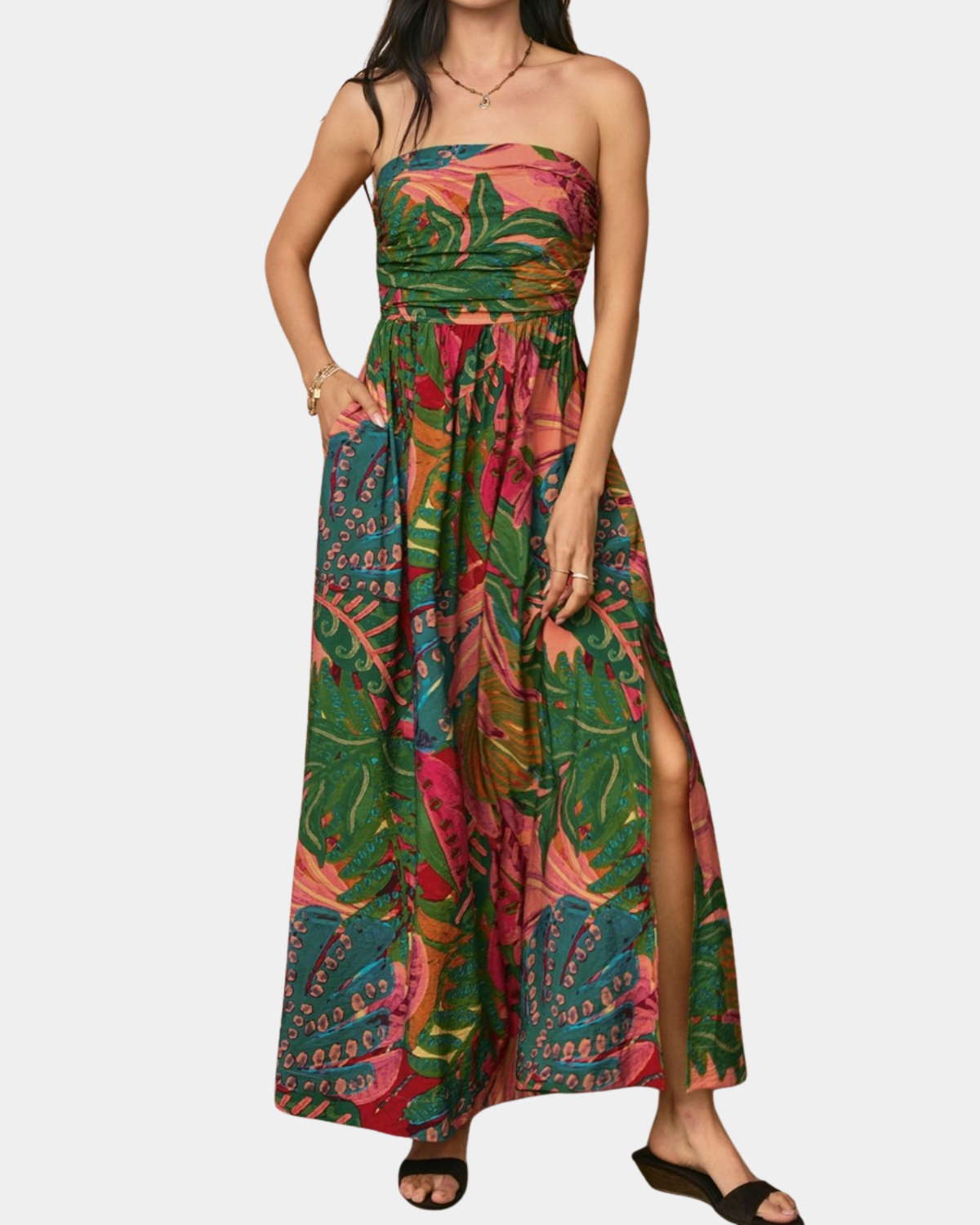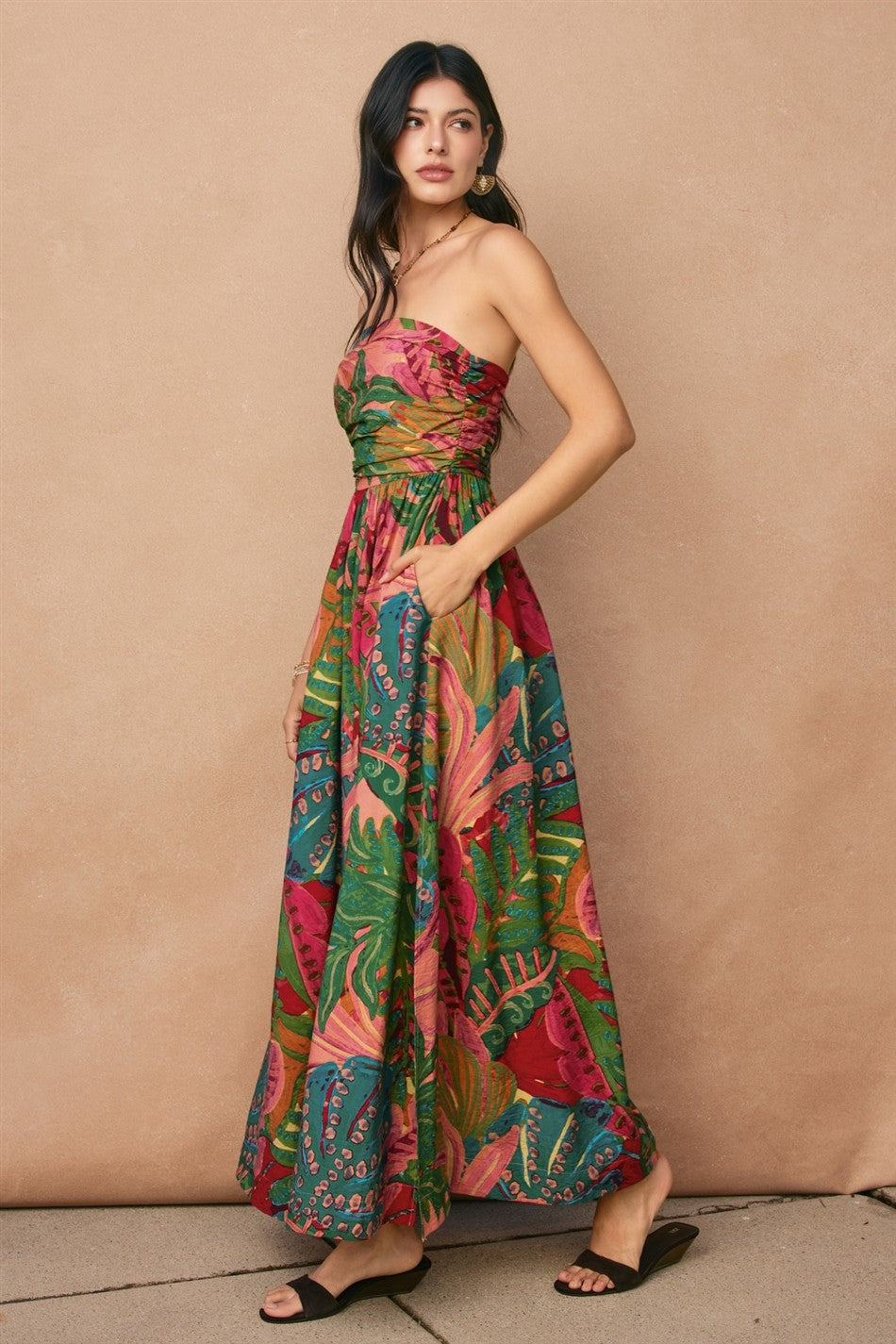 Breezy strapless midi in a tropical leaf print rayon-nylon blend with flattering ruching. Perfect for warm-weather adventures and vacation-ready style.
