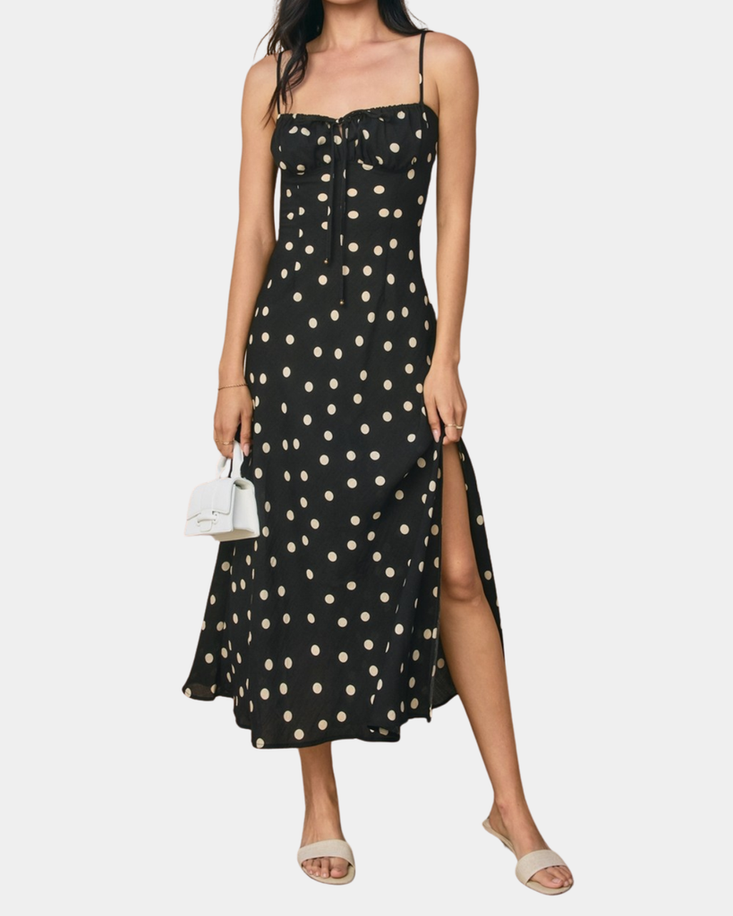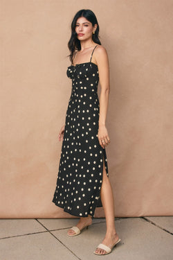 Sleek polka dot maxi dress that lets you shine without the sleeves. Black and ivory perfection for any occasion.