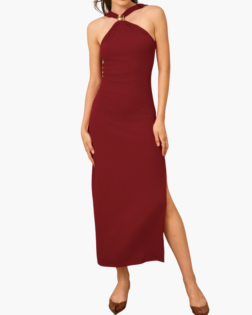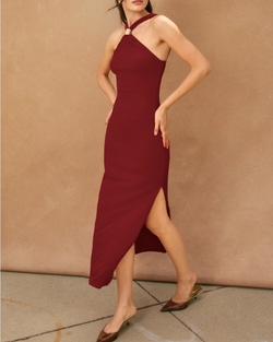 This red halter neck dress combines a rib-knit texture with luxurious gold applique for a polished, elegant look. Designed to flatter and impress, it’s perfect for stylish occasions demanding sophistication.