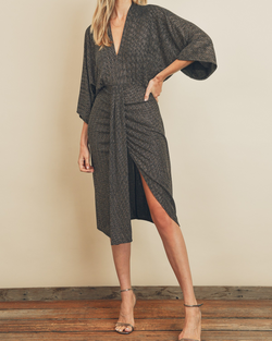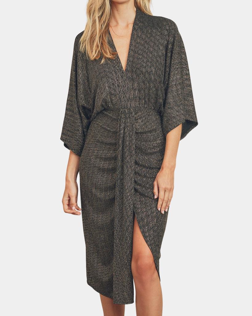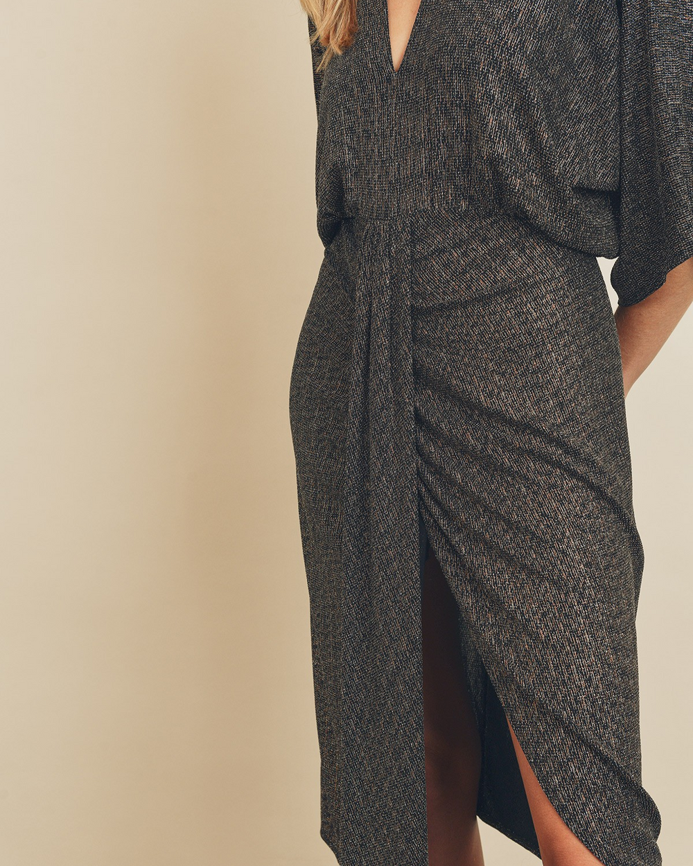 This black and gold Metallic V-Neck Midi Dress features a striking deep V neckline and a gracefully ruched skirt with a delicate slit. Its elasticated waist provides a refined and flattering silhouette.