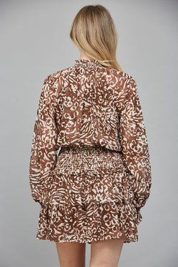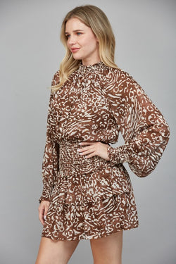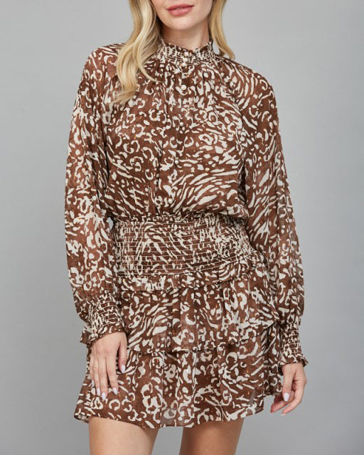 Elevate your fall wardrobe with this sophisticated animal print chiffon mini dress. Featuring a delicate lurex weave for subtle shimmer, it offers long sleeves and a smocked waist that accentuates your silhouette gracefully. Its lightweight chiffon fabric adds an airy touch, making it perfect for both day and evening occasions.
