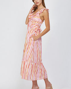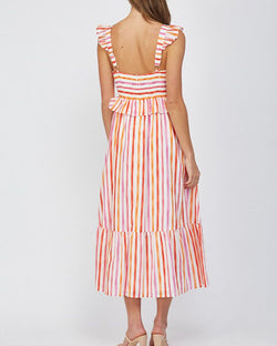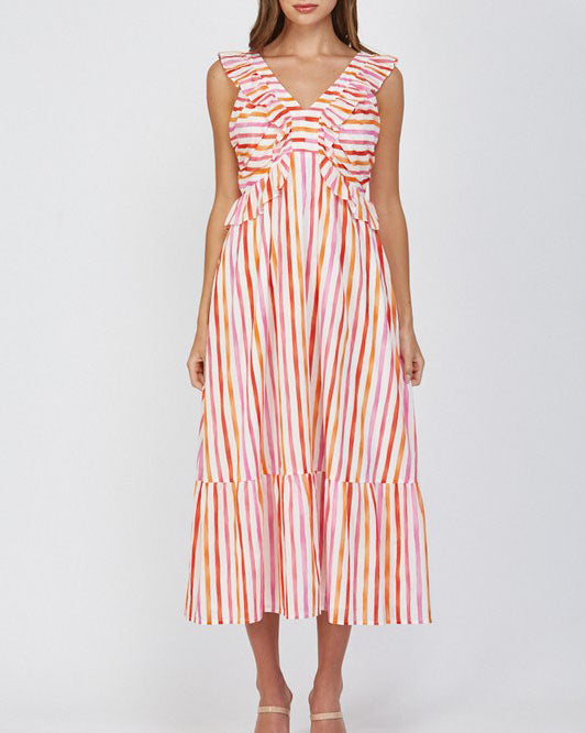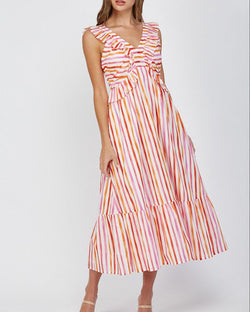 This multi color stripe midi dress screams summer! Featuring a bright array of colors, a v-neckline, and ruffle details, this dress is perfect for summer day outings and events. A staple to wear all season.