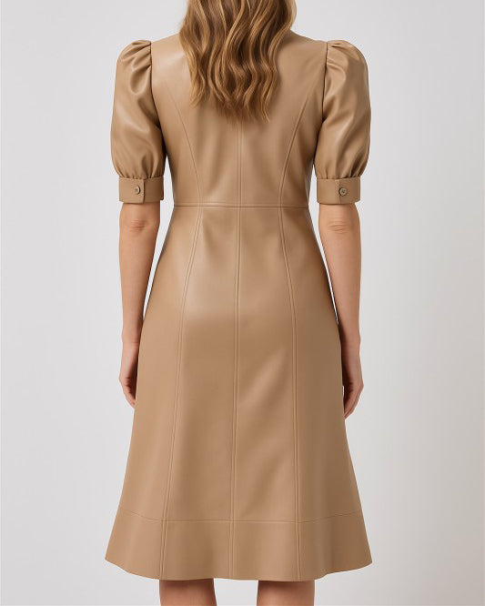 This chic faux leather midi dress features a v-neckline, front zipper closure and short sleeves. Easy to dress up or down, this dress is a must for the new season.